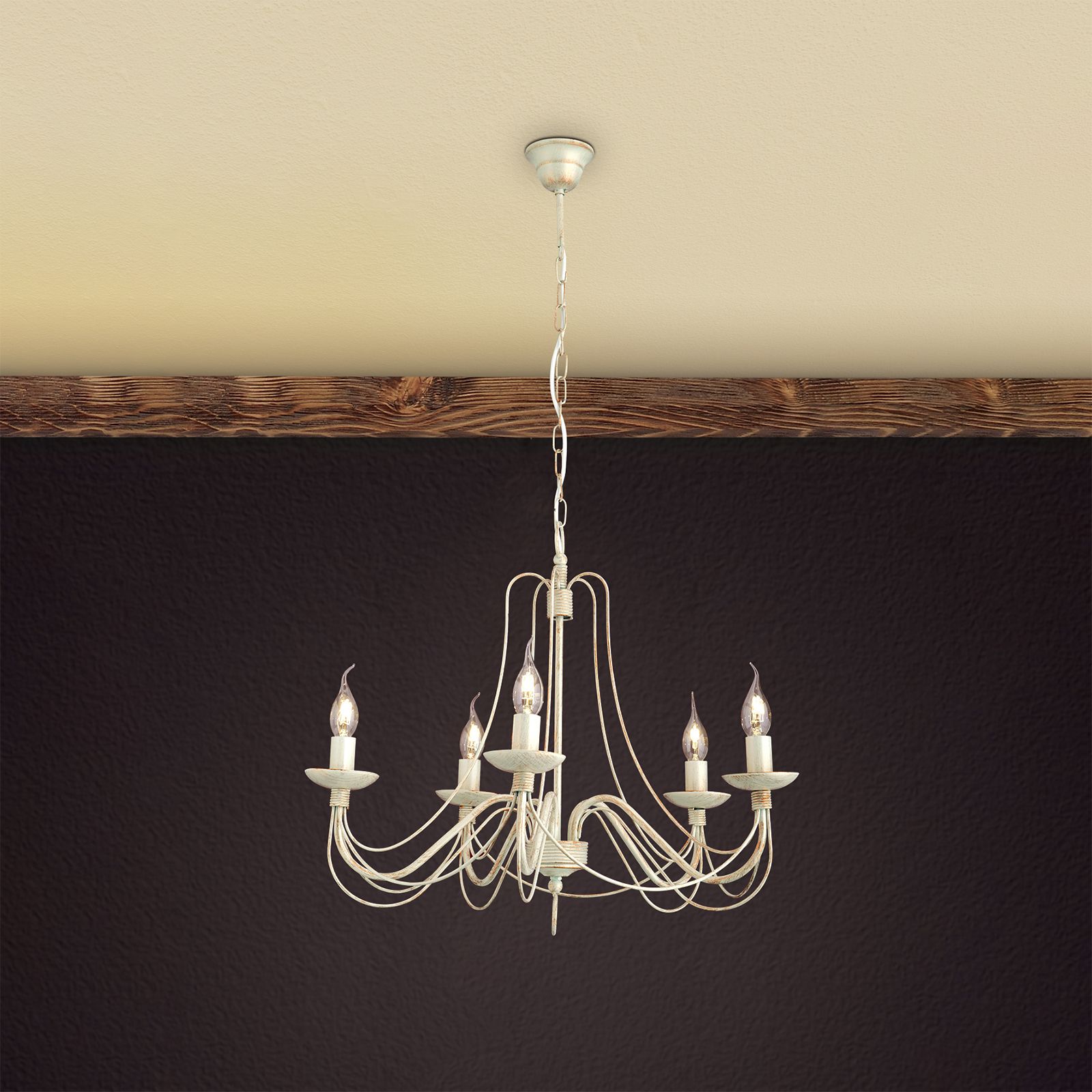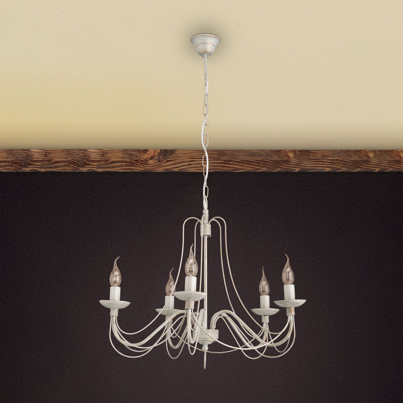 The 5-flames chandelier from the VELA series perpetuate the wrought iron artwork of Flemish and Lübeck master workshops. The fusion of different eras - Baroque, Rococo, Empire - with tastefully contemporary design elements results in a chandelier blending in well with antique décor as well as modern styles. The fine stays sweepingly connect the flames to the arm attachments from which the shaft top seems to spring like a fountain. The individual flames are connected in a ring pattern. The chandelier has five E14 sockets with 40 watts maximum each.