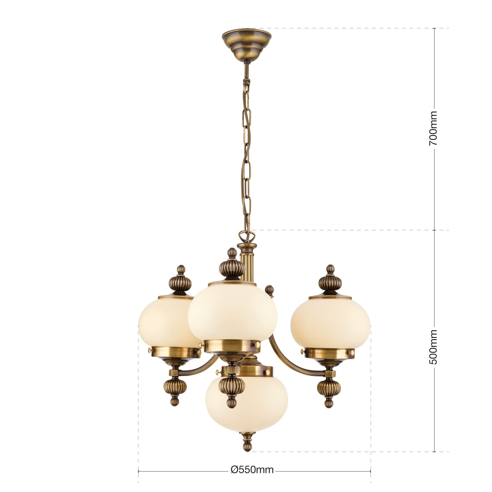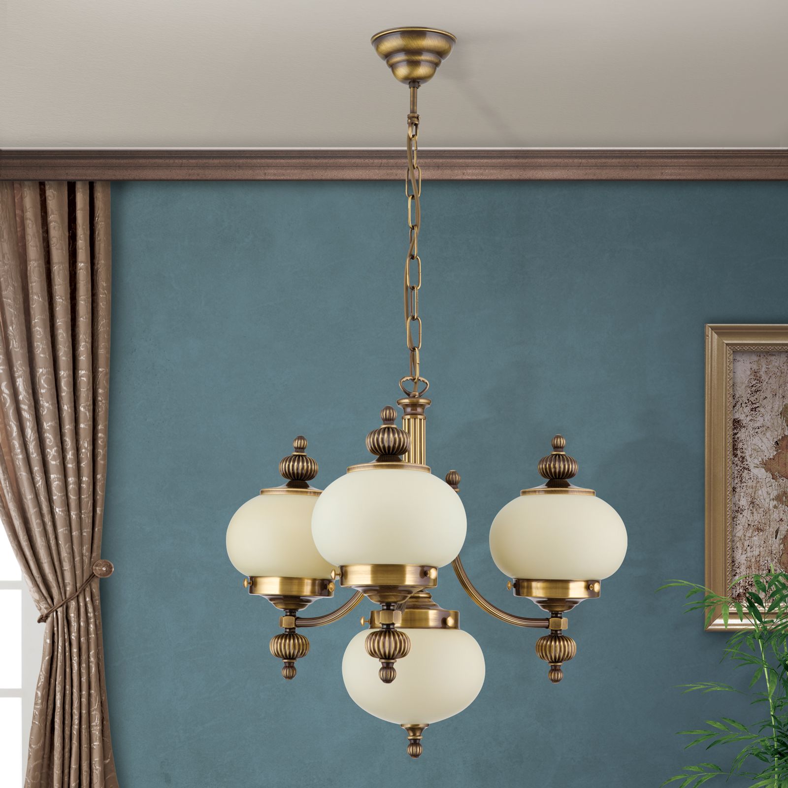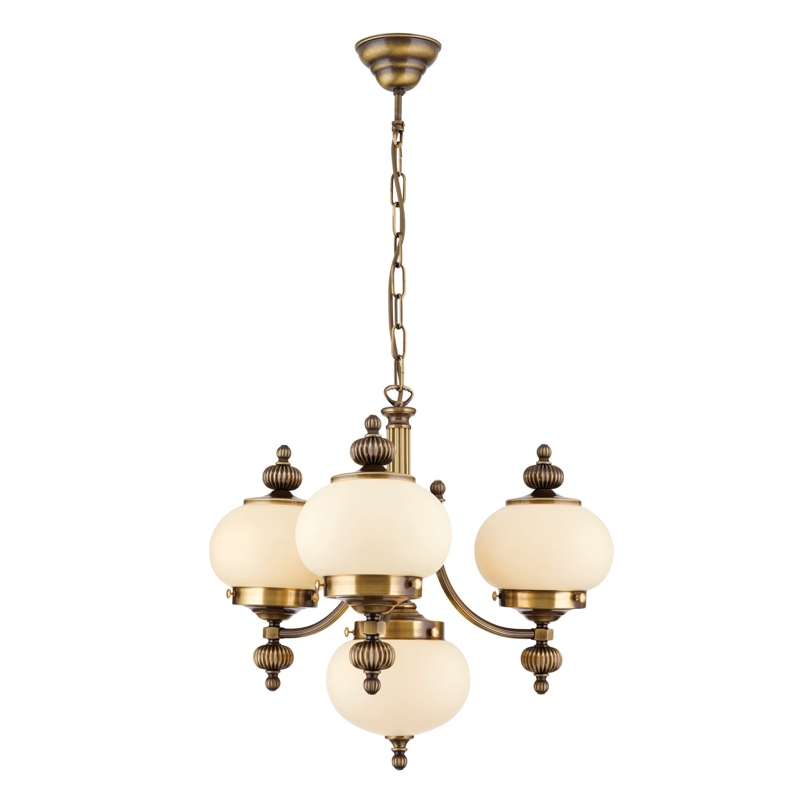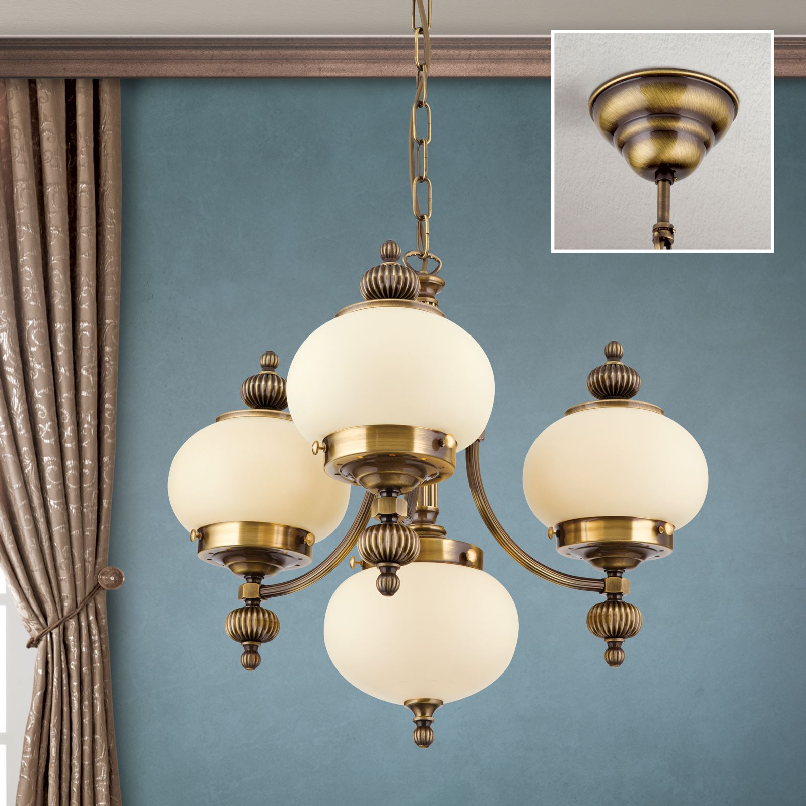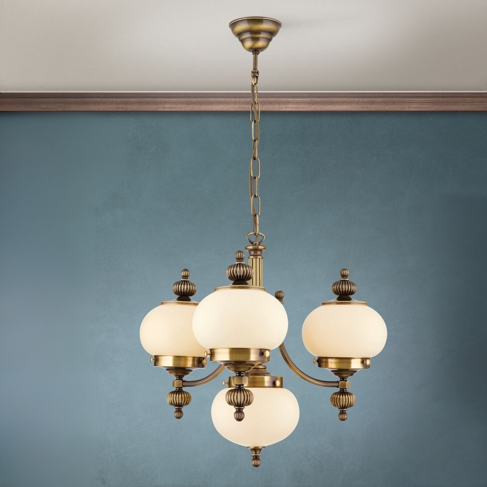 Chandelier WIENER NOSTALGIE, 3+1 lamps, antique brass finish, upwards, champagne coloured glasses