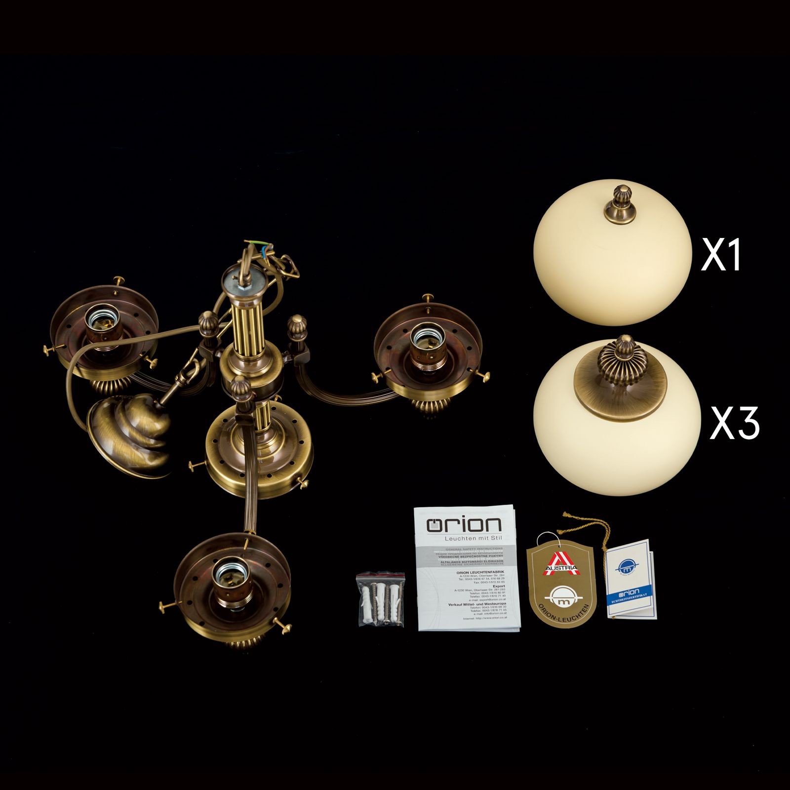 The 3+1-flame chandelier from the WIENER NOSTALGIE series is ideal for illuminating small, whimsical areas. The upward-facing shades illuminate walls and ceiling evenly reflecting light. A central downward-facing shade provides sufficient illumination above dining tables or in bedrooms, for example. Its compact composition also predestines the chandelier for smaller rooms. Discreet decorative elements, clear lines, typical for Viennese Fin-de-Siècle style, enrich every stylish interior. E27 sockets supply the chandelier four times with 60 watts maximum each.