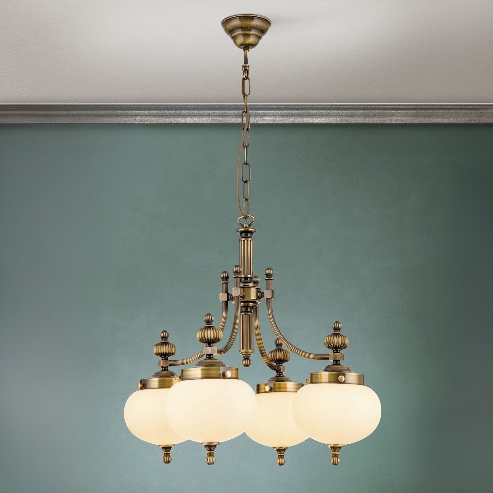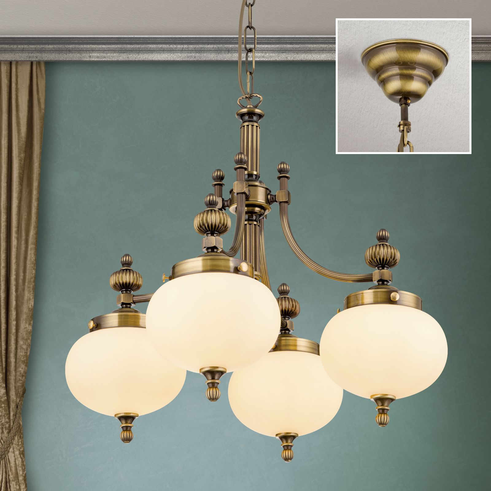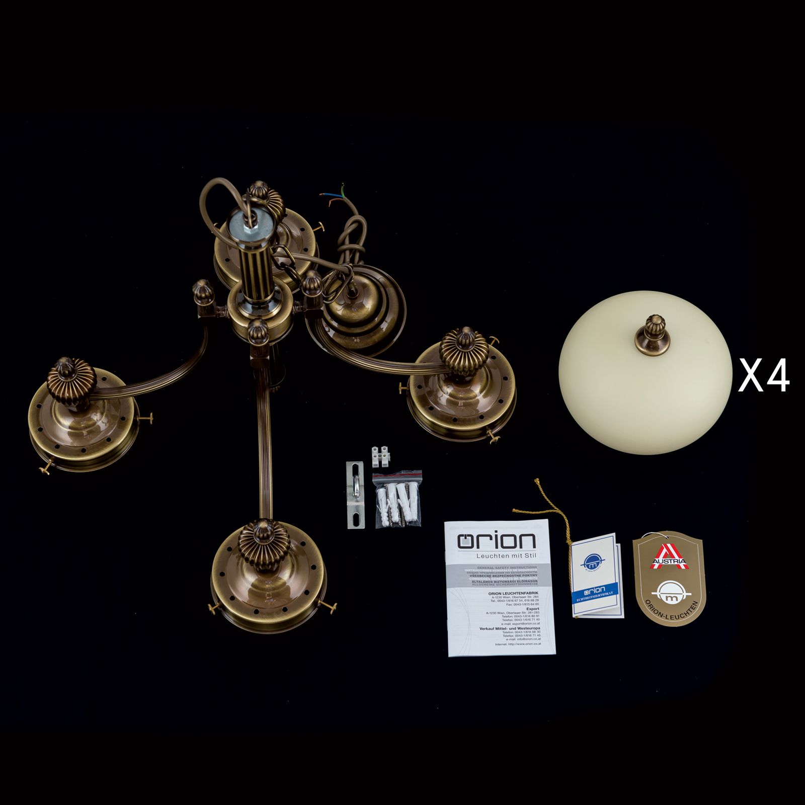 The scent of freshly brewed coffee and "Kaiserschmarrn" pancakes served hot can almost be smelled at the sight of the four-flame chandelier from the WIENER NOSTALGIE series. Confidently powerful shapes of the then new electrical era were united with timelessly elegant curves of glass shades and chandelier arms. Some simple decorative elements, such as fluted shaft and folded brass spheres as finials, were borrowed from earlier eras. However, the decorations also fulfil the function of multi-faceted reflectors making the light shine all the more. The chandelier is a worthy representative of Viennese coffee house style. It has four E14 sockets for 60 watts maximum each. Fitting energy-efficient lamps is climate friendly and cost efficient.