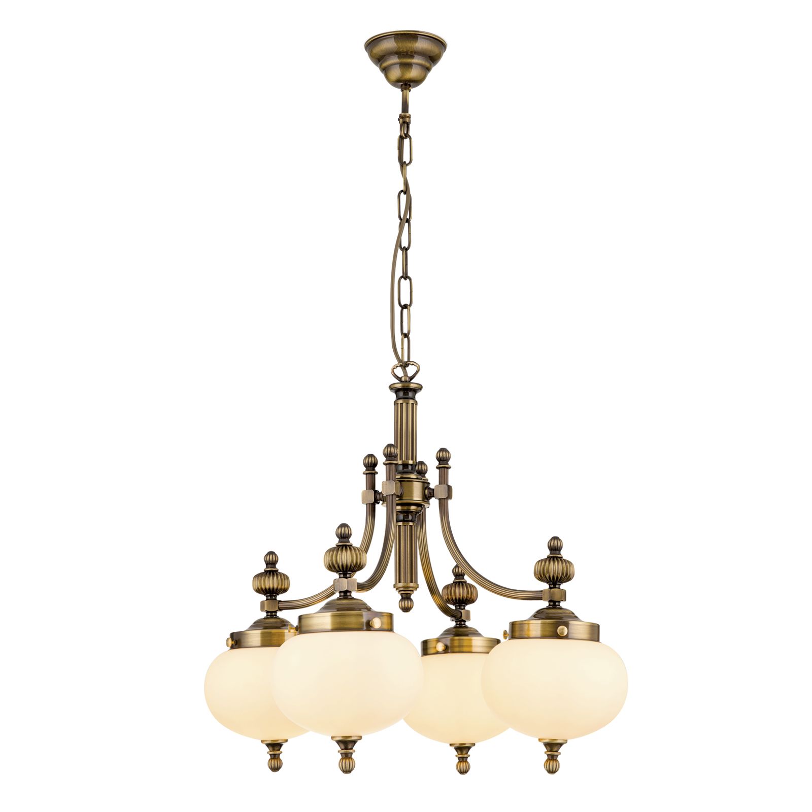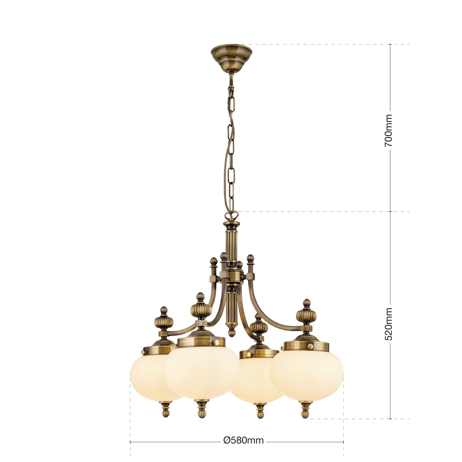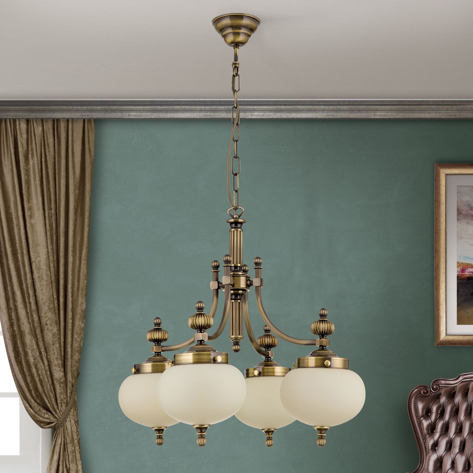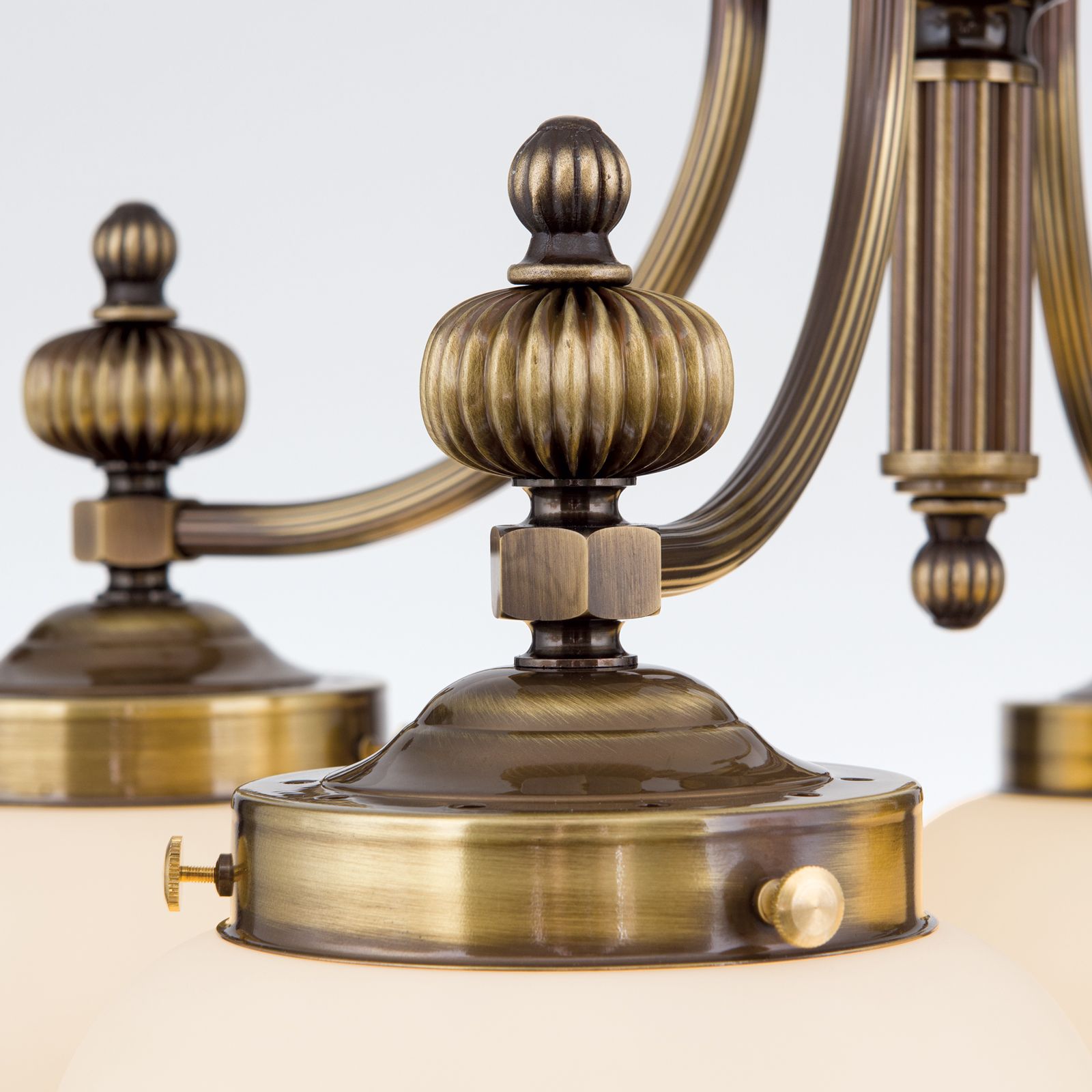 The scent of freshly brewed coffee and "Kaiserschmarrn" pancakes served hot can almost be smelled at the sight of the four-flame chandelier from the WIENER NOSTALGIE series. Confidently powerful shapes of the then new electrical era were united with timelessly elegant curves of glass shades and chandelier arms. Some simple decorative elements, such as fluted shaft and folded brass spheres as finials, were borrowed from earlier eras. However, the decorations also fulfil the function of multi-faceted reflectors making the light shine all the more. The chandelier is a worthy representative of Viennese coffee house style. It has four E14 sockets for 60 watts maximum each. Fitting energy-efficient lamps is climate friendly and cost efficient.