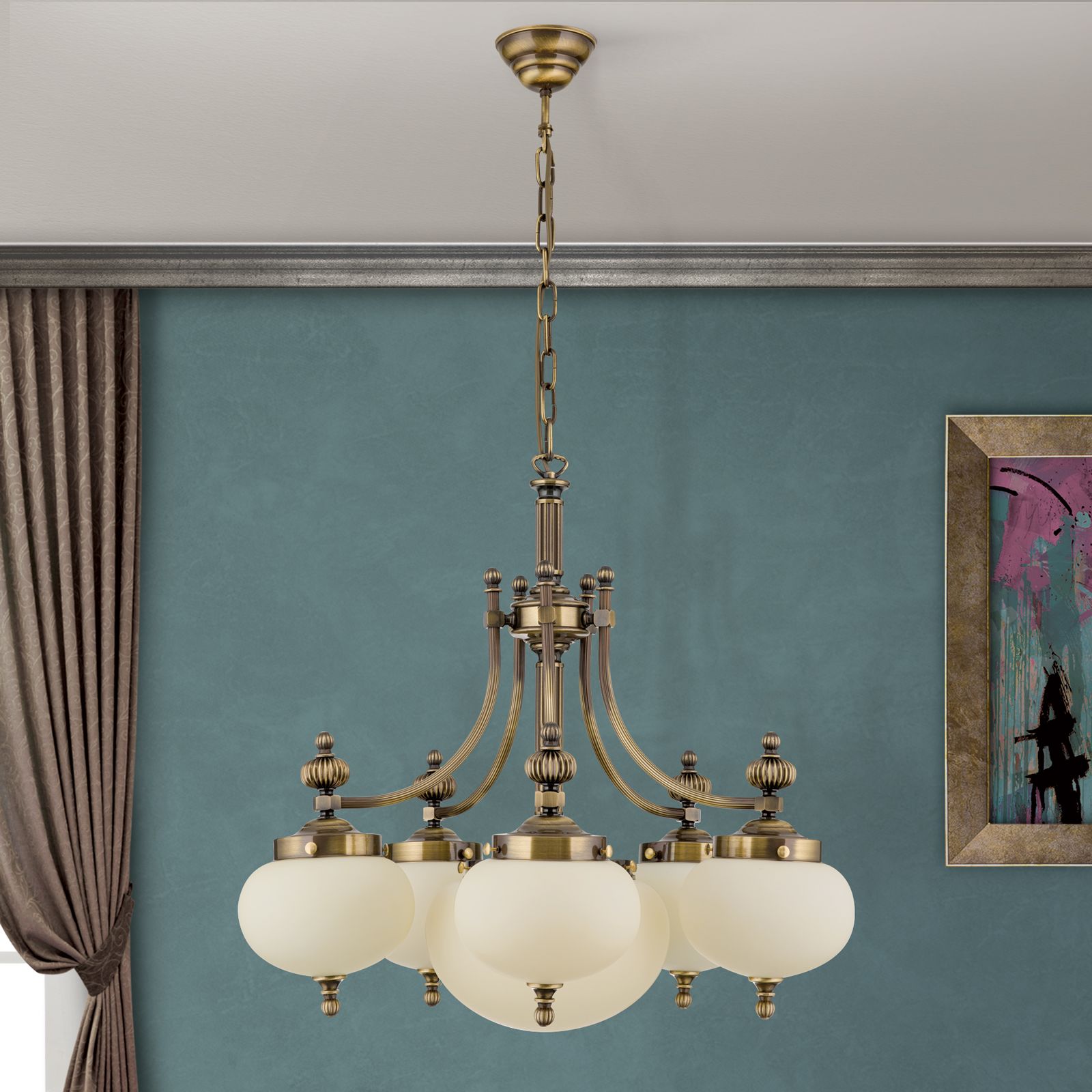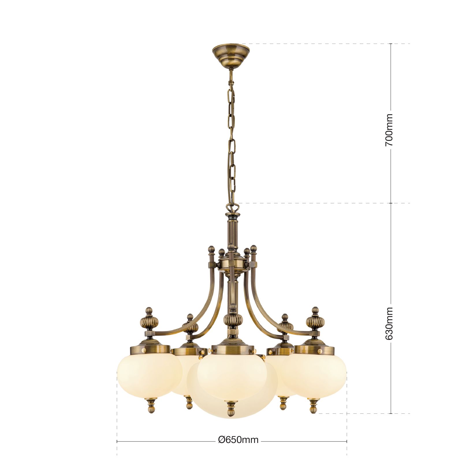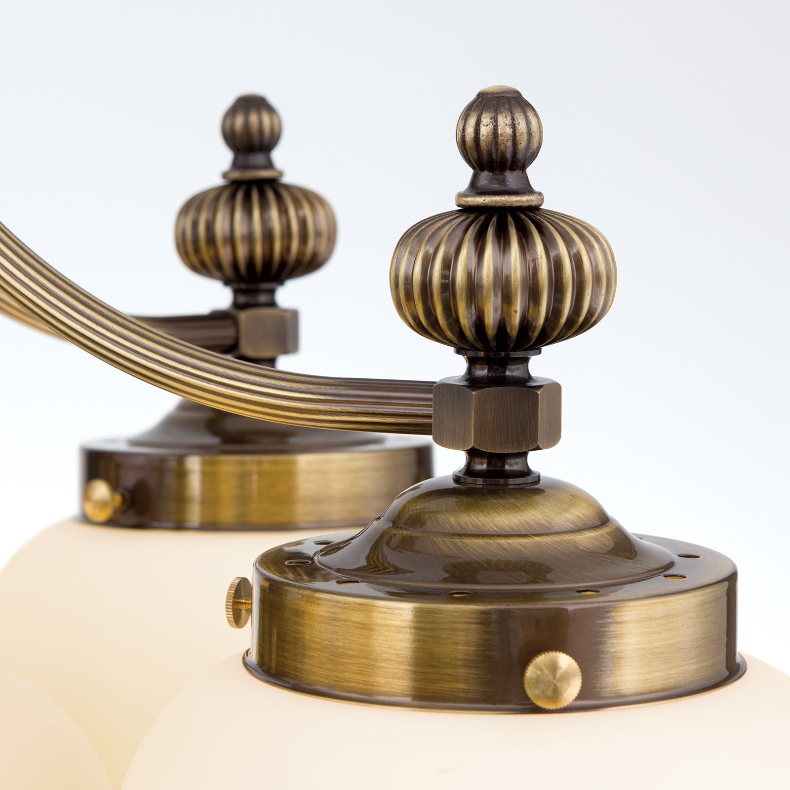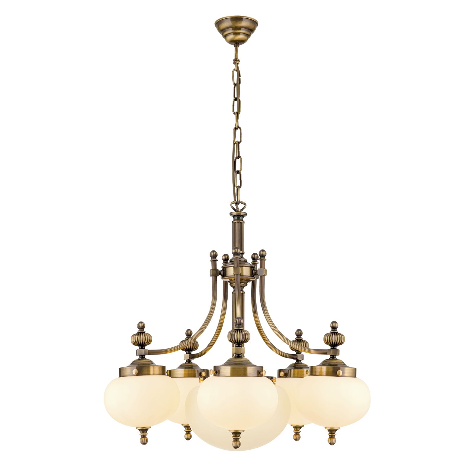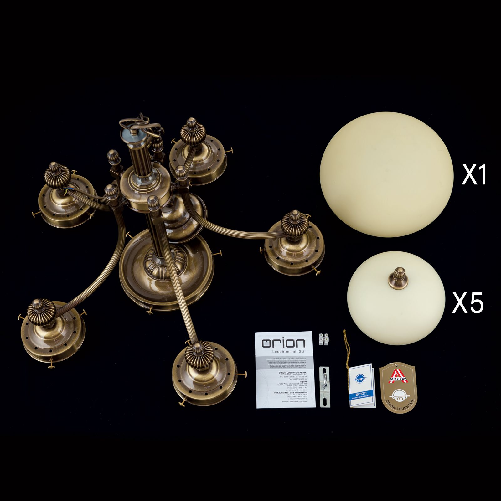 The chandeliers from the WIENER NOSTALGIE series are worthy representatives of the traditional Viennese coffee house style. The obvious need for powerful lighting is met by generously sized glass shades radiating downwards. The high-quality brass frame with fluted column and sweeping arms fades modestly into the background. The folding spheres as shade finials playfully quote the receding splendour of historic chandeliers. Its luminosity is suitable for 20 to 30 square metre rooms ranging from antique style to functional-modern. The chandelier is fitted with six E27 sockets, each with 60 watts maximum.