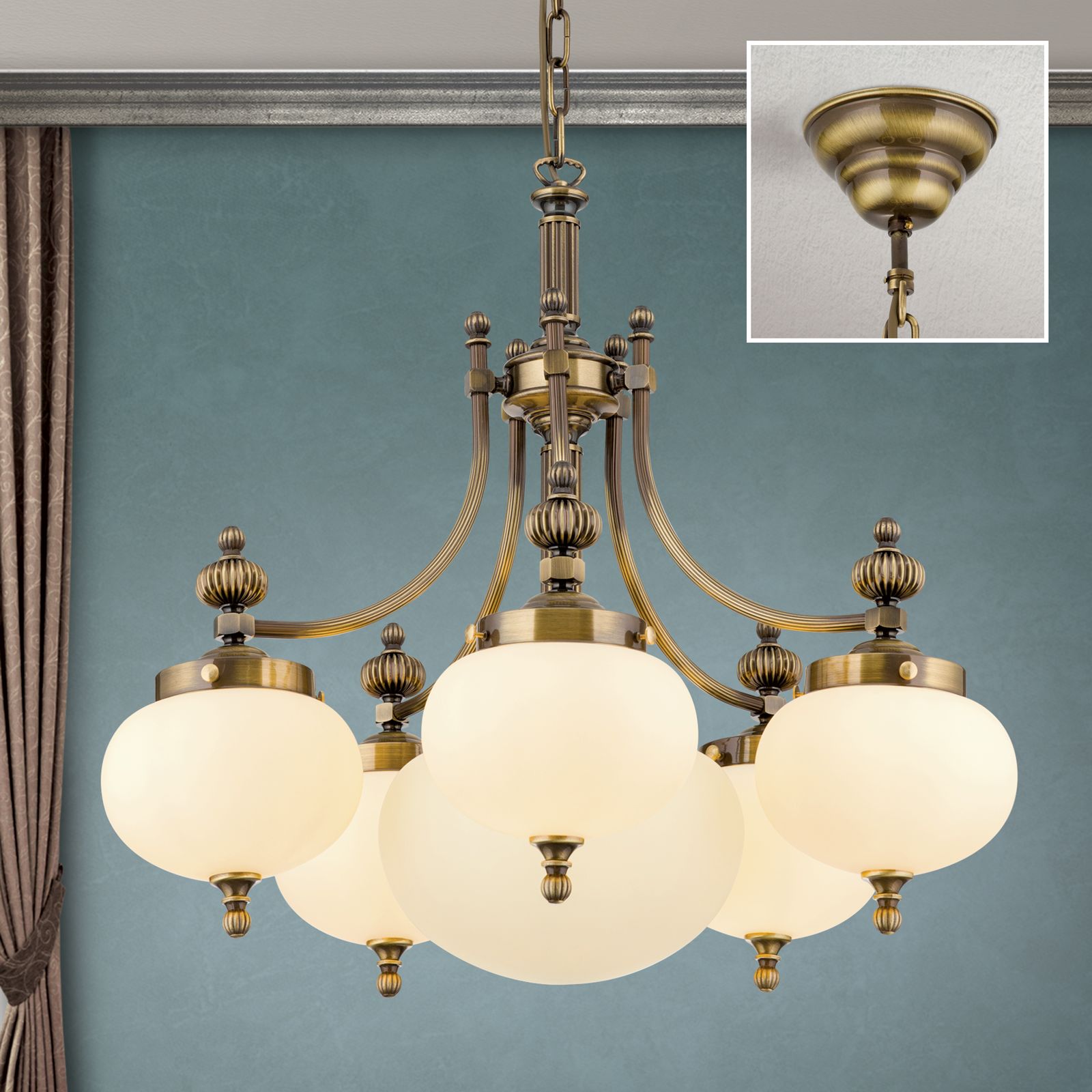 Chandelier WIENER NOSTALGIE, 5+1 lamps, antique brass finish, downwards, champagne coloured glasses