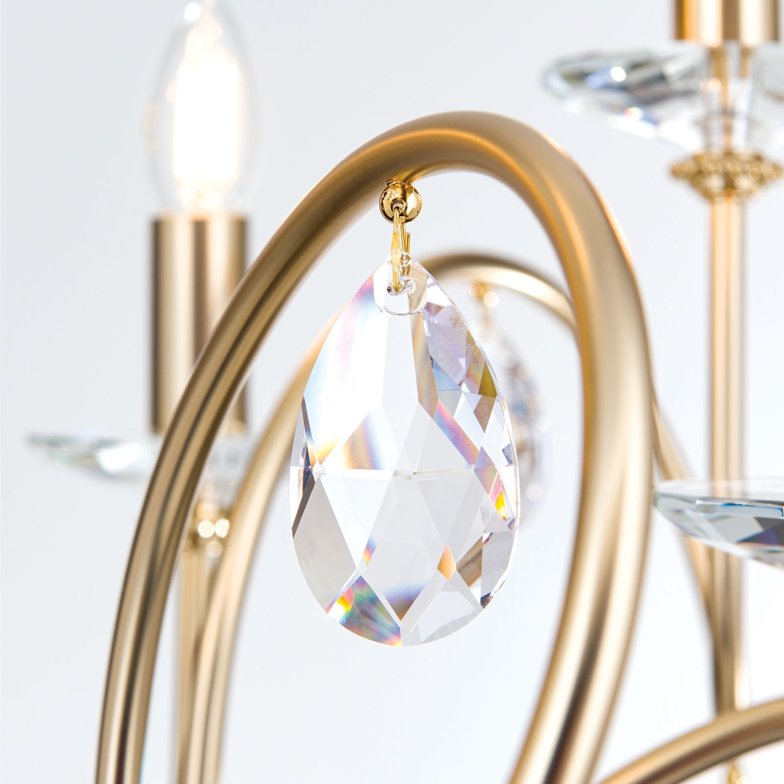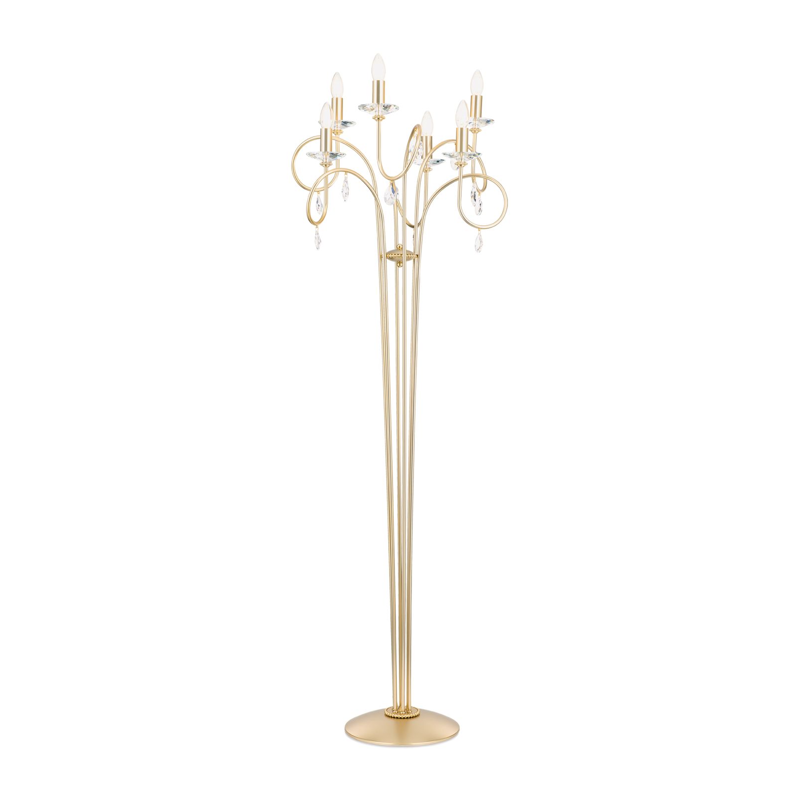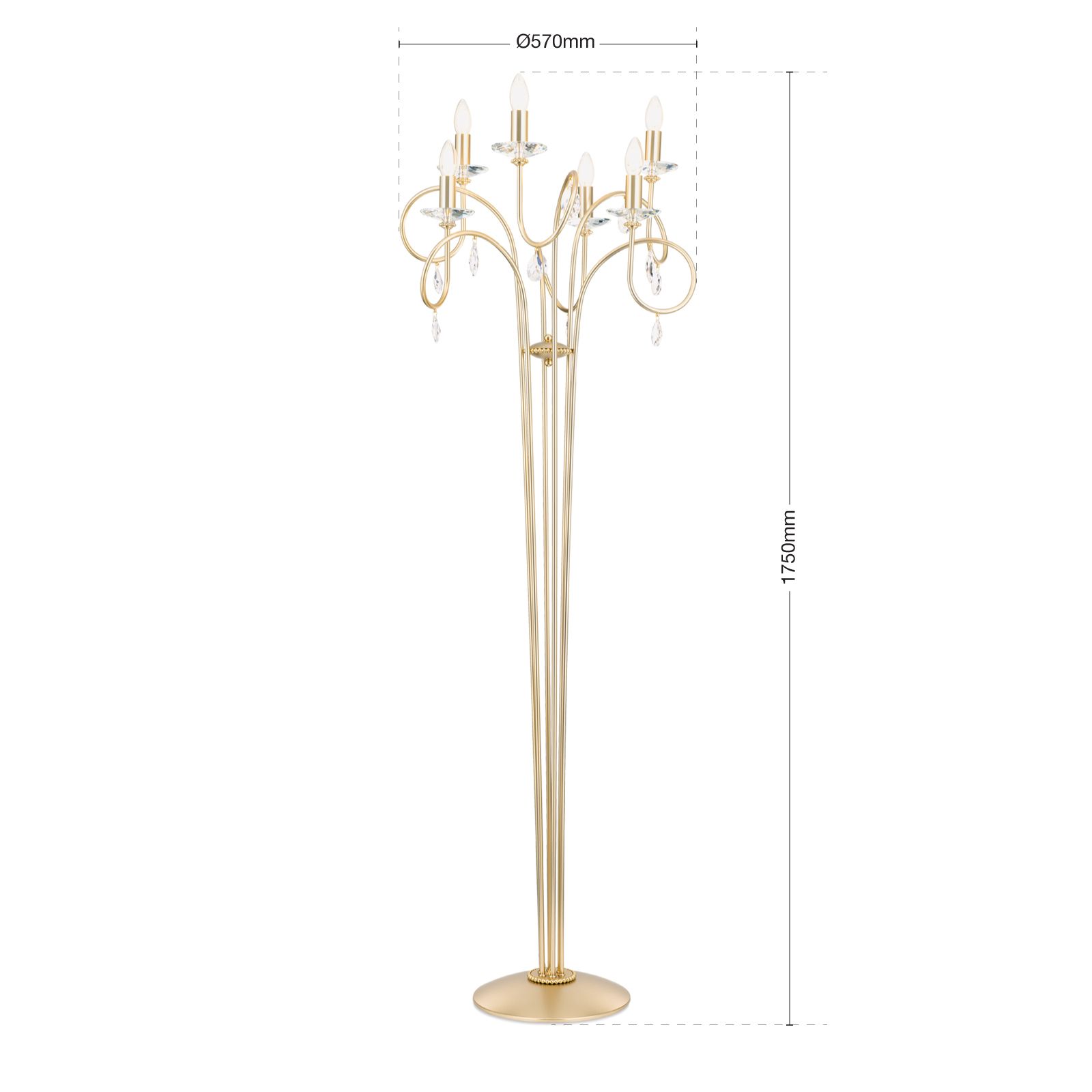 Magnificent floor lamp GIADA exudes quality, elegance and high-quality workmanship consummate for classically designed living rooms. It not only generates an abundance of light, but also acts as noble design element. Special feature are the curved tendrils with 1A full-cut drop catchers and crystal drops as the radiating light makes them sparkle.