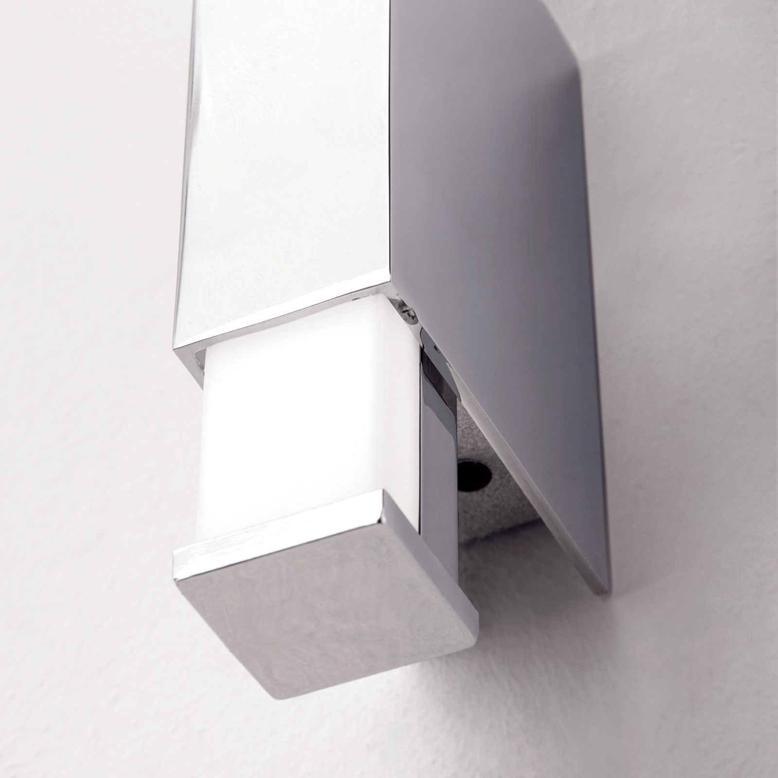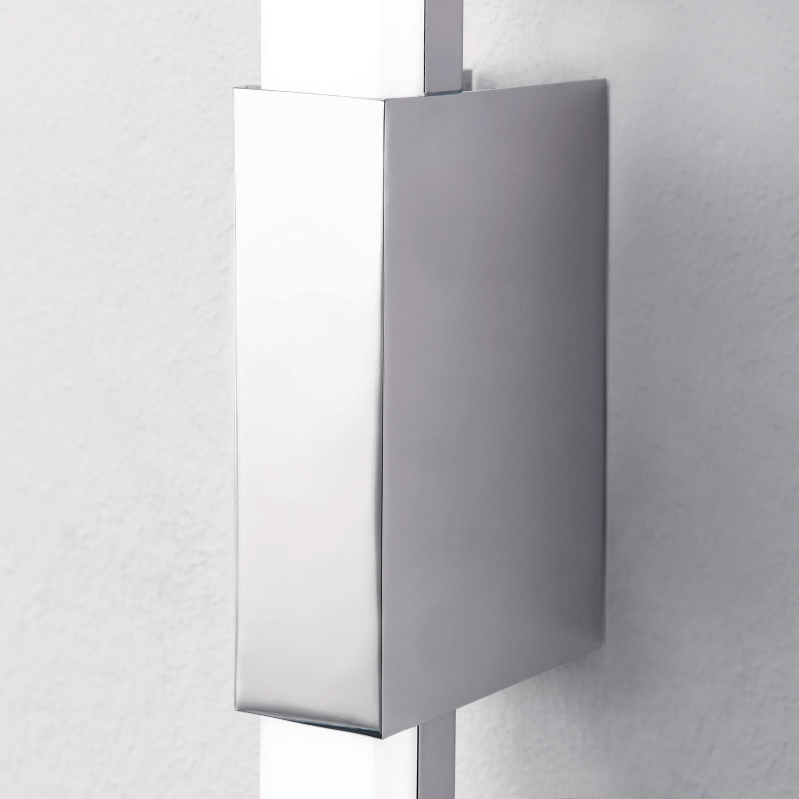 Understated design with cubistic elements in chromed steel and a satinated diffuser give the bathroom luminaire a simple elegance.
