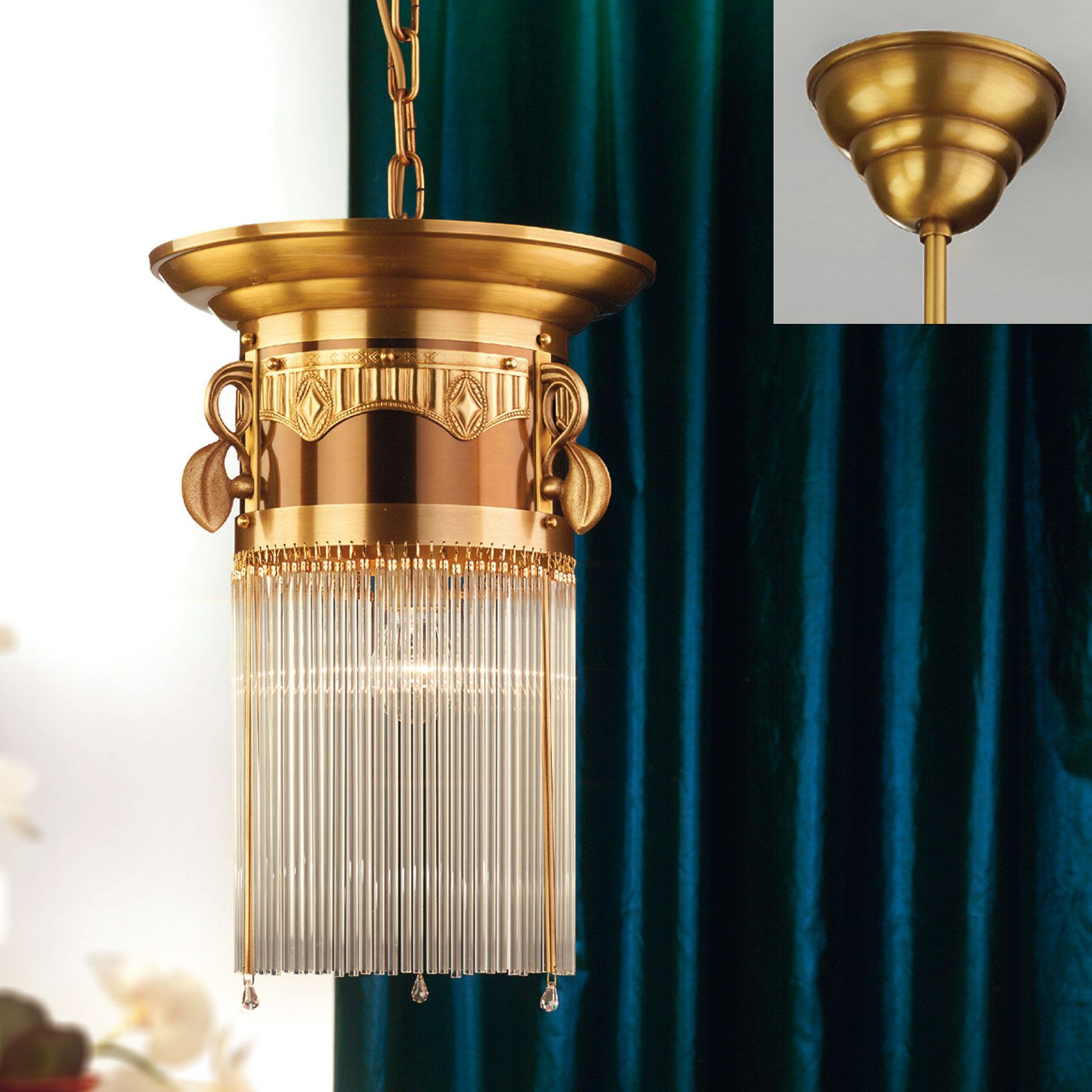 With its total height of 124 centimetres, this pendant lamp from the ADELE series is ideal for high rooms. It will look perfectly placed in the entrance hall of an historic apartment building as it will above dining tables or in the entrée of a doctor's office. A light of high quality will always provide splendid illumination. Detailed decorative elements such as leaf tendrils, embossed friezes and fine profile elements are rounded off by effectual glass rod hangings typical of Art Nouveau. The light has an E27 socket for up to 60 watts. Using LED bulbs saves costs and energy.