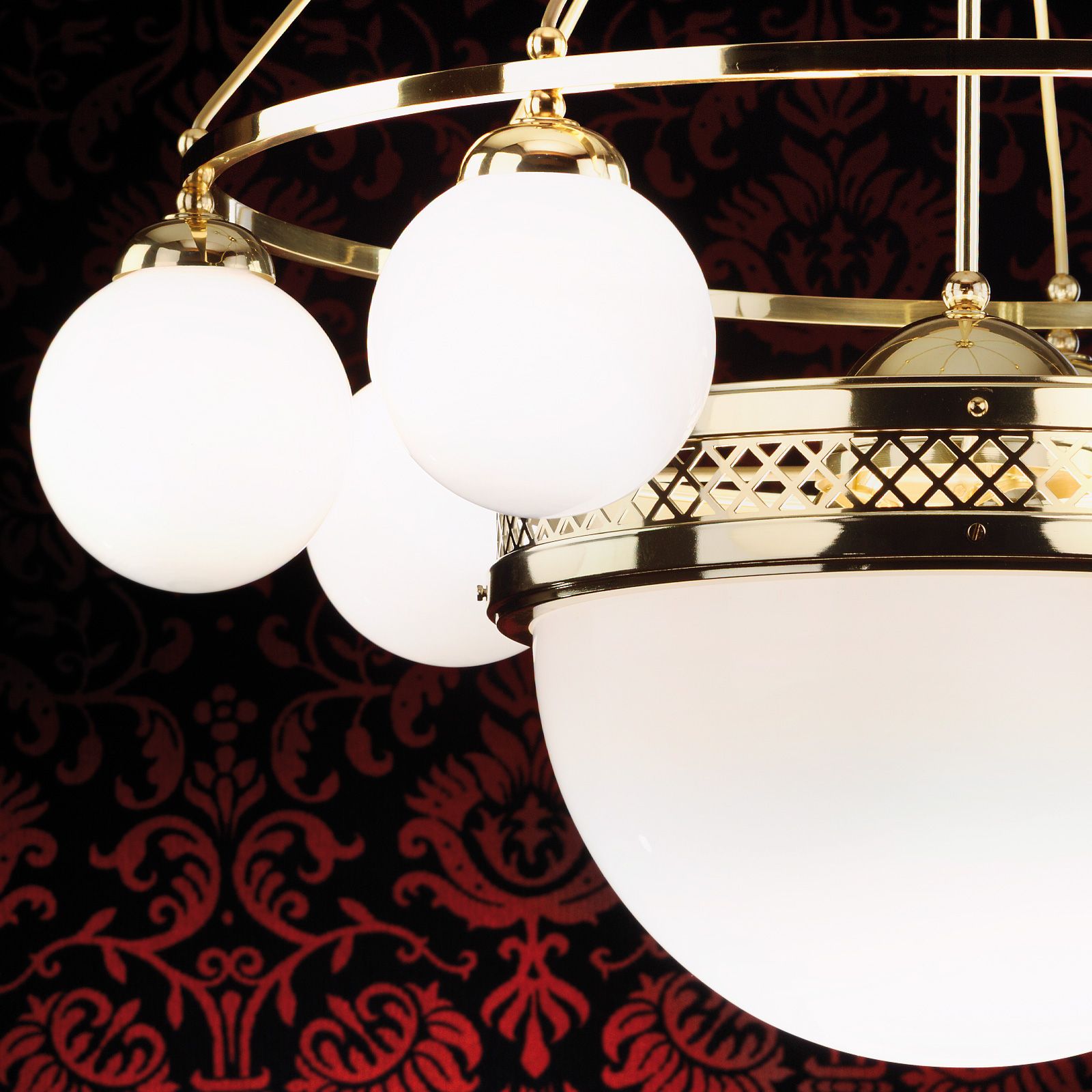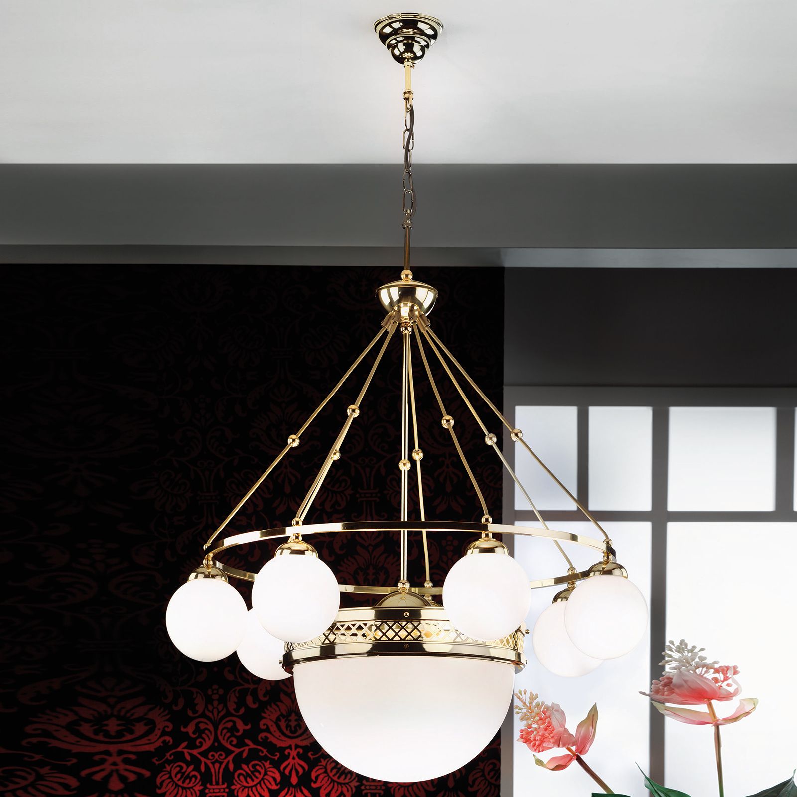 Pendant lamp ALT WIEN, 7+1-flames, brass glossy, with opal glossy glass