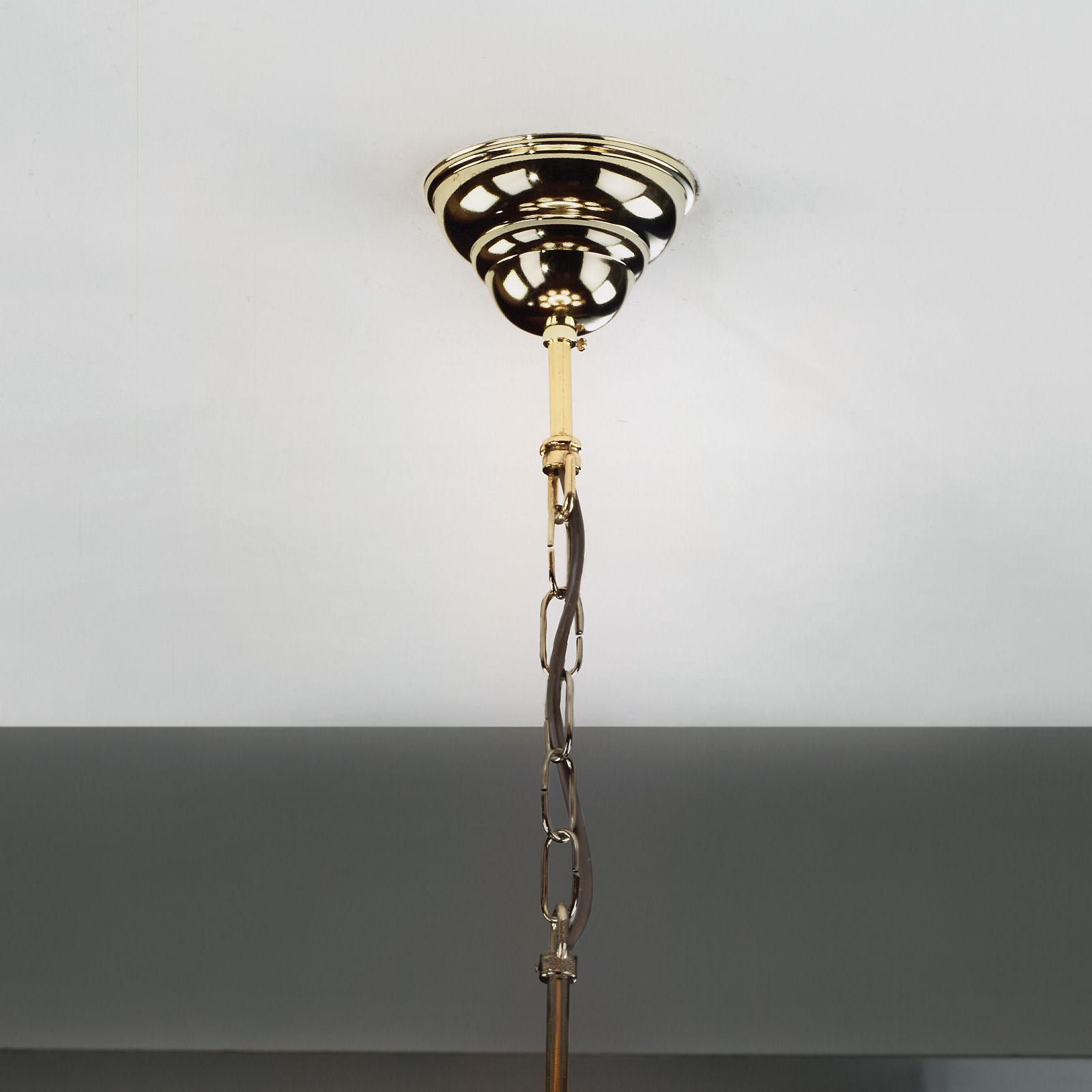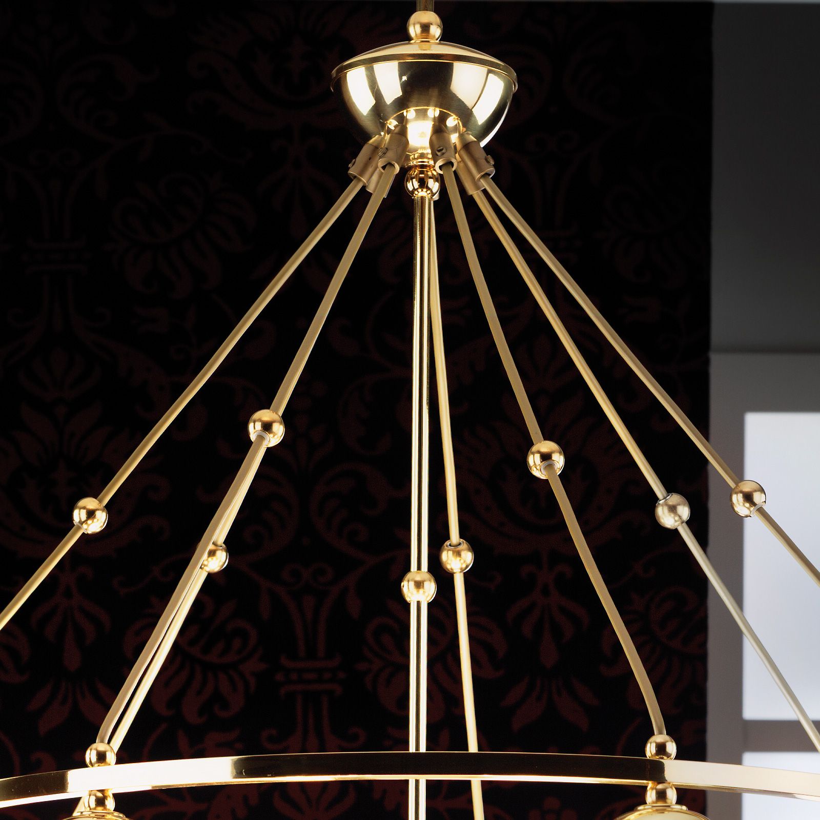 The 8-flames pendant lamp from the ALT WIEN series takes inspiration from Adolf Loos' popular 1914 Brioni lights yet makes an independent design statement. Its structure sets a striking accent while remaining airy and discreet: seven light spheres are grouped around one large light dome in the centre - all connected to each other by a brass ring with the cables converging in a bowl in the centre. An elegant brass ring encloses the large central shade. The sparing use of ornaments emphasises the materials' high quality and lets it adapt to many interiors.