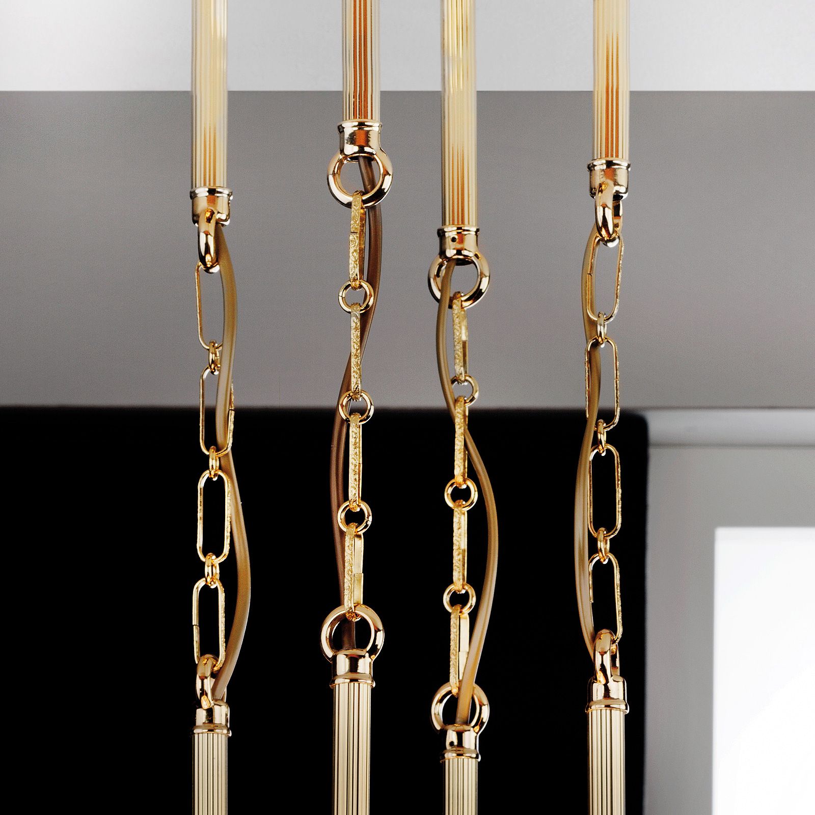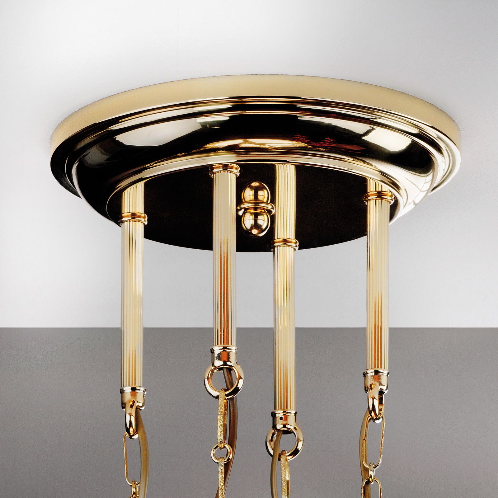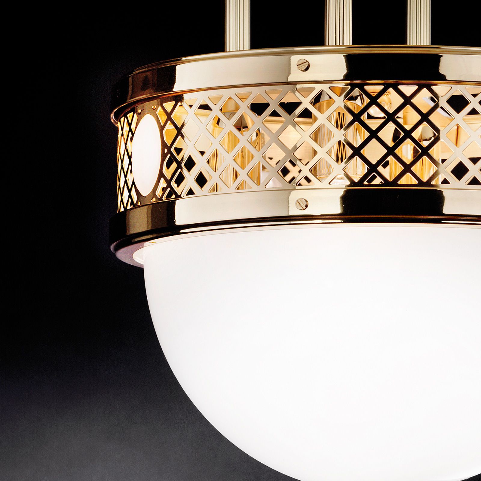 This pendant lamp from the ALT WIEN series conveys a noble splendour in its finely worked details: the suspensions' flutings, the rings typical of Art Nouveau or thesurround lattice are all small connaisseur charms from our manufactory. The hemisphere corresponds in balanced proportion with the surround dimensions and shaft length. The chains inserted between upper and lower shafts creates a pleasant weightlessness. Furniture with airy sweeps and generous floral patterns could be adequate companions. The pendant lamp is equipped with four E14 sockets with 40 watts maximum each.