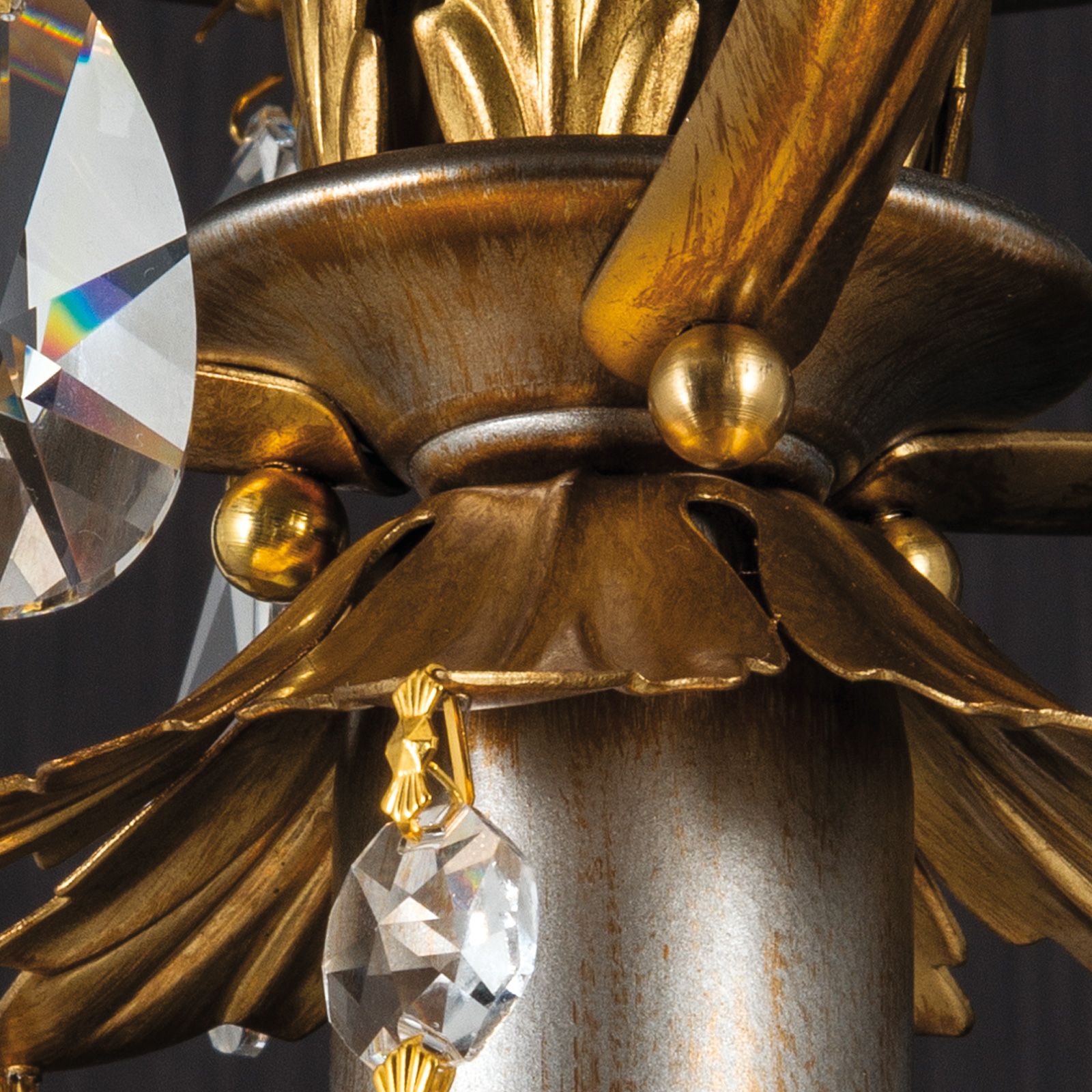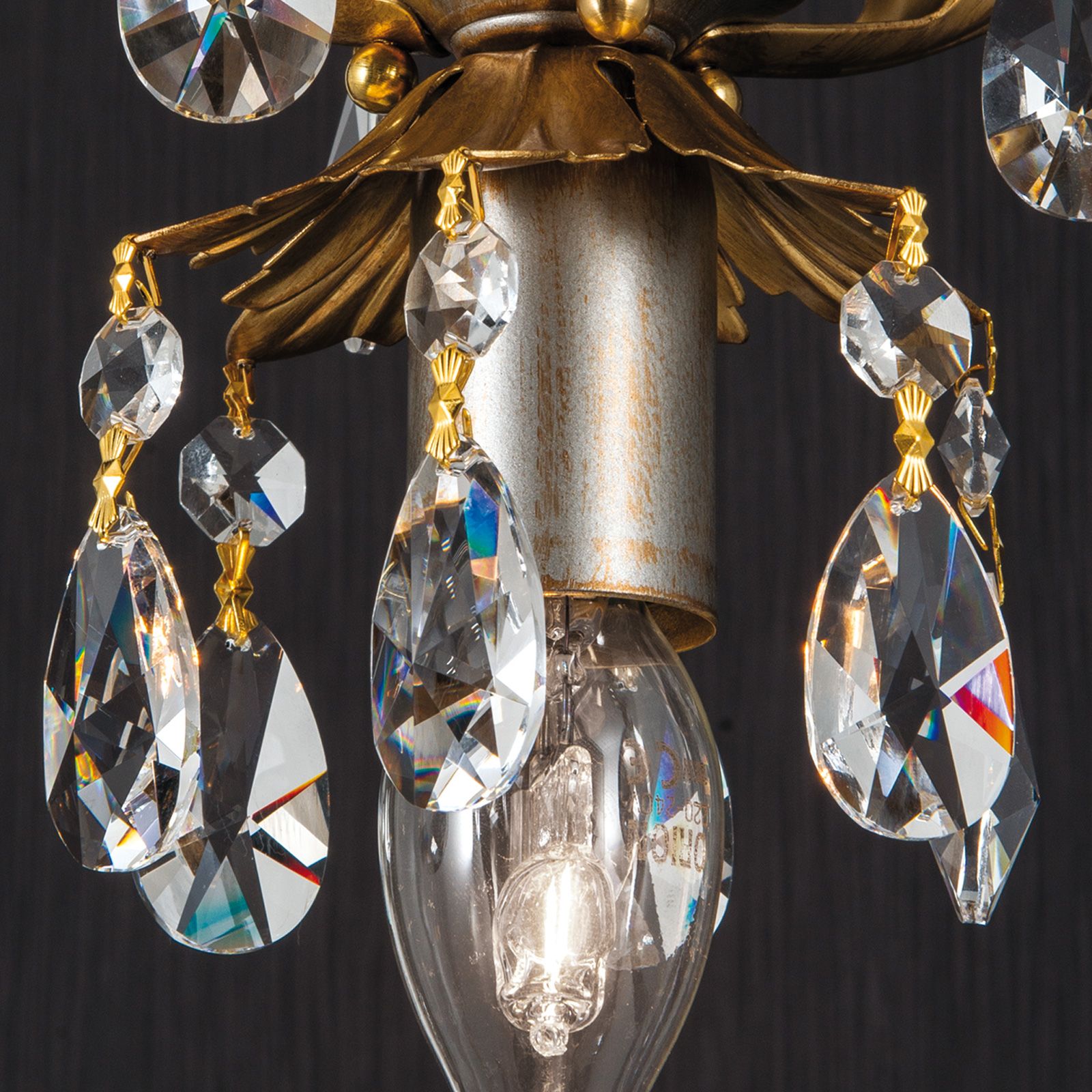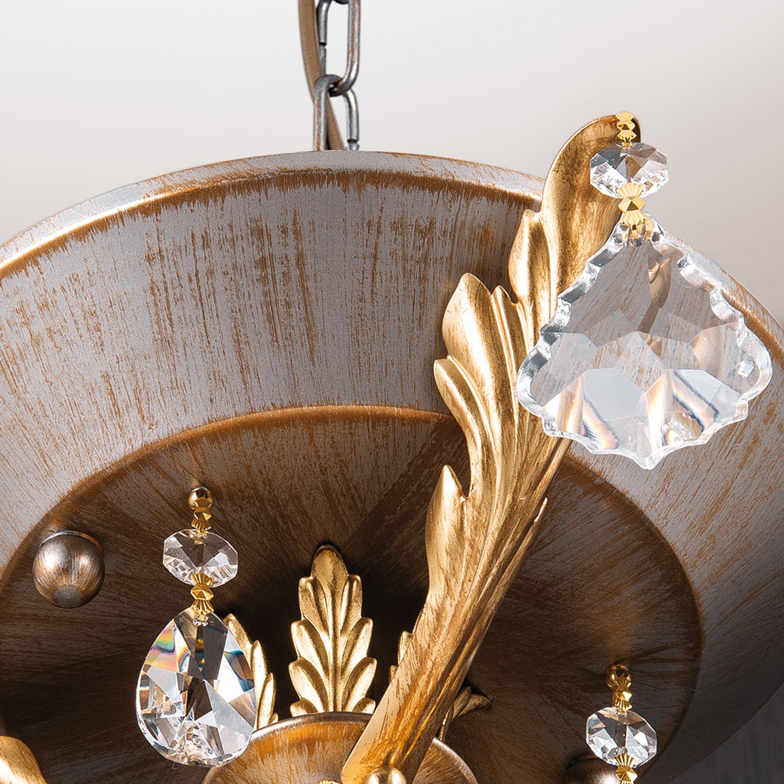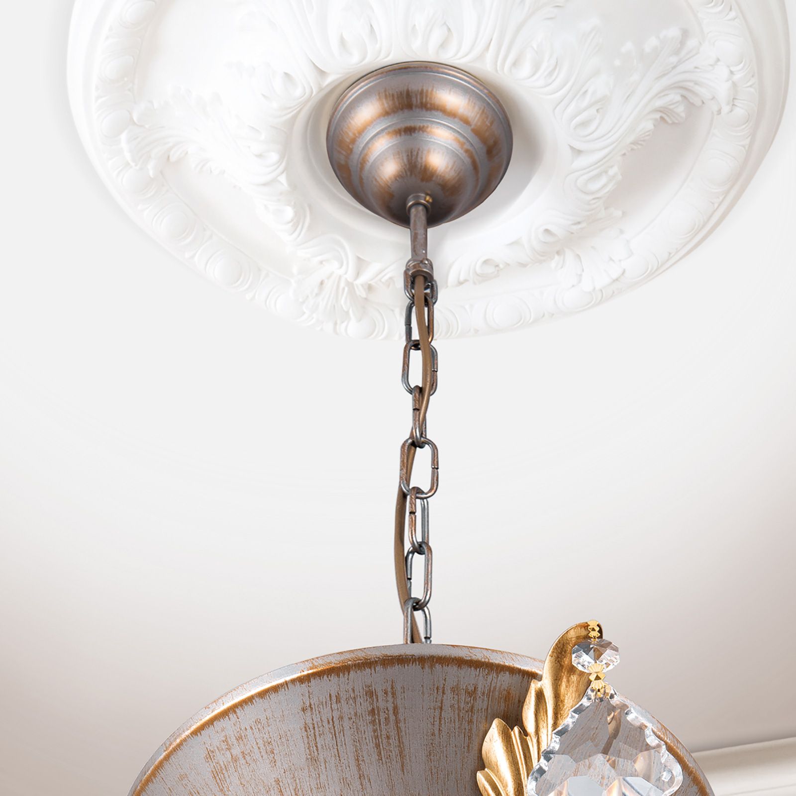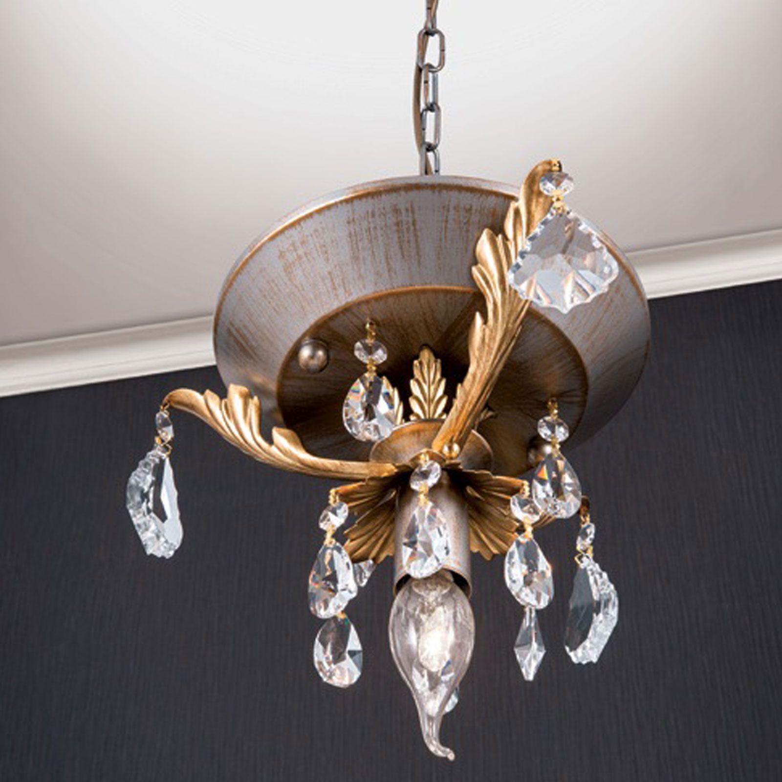 The 1-flame pendant lamp from the MIRAMARE series resembles a mythical creature from the deepest sea. Leaves and blossoms entwine the lamp holder. The chandelier crystal is reminiscent of coral. The hand-shaded bowl made of solid brass looks like the head of a sea anemone. Sparkling crystal pendulums and almonds make light rays divided into all spectral colours glitter like waves. This Mannerist - or Late Renaissance - style light is suited for spotlighting a piece of furniture as decorative object or for highlighting a designated area living or bedrooms. The light is equipped with an E14 socket for up to 40 watts.