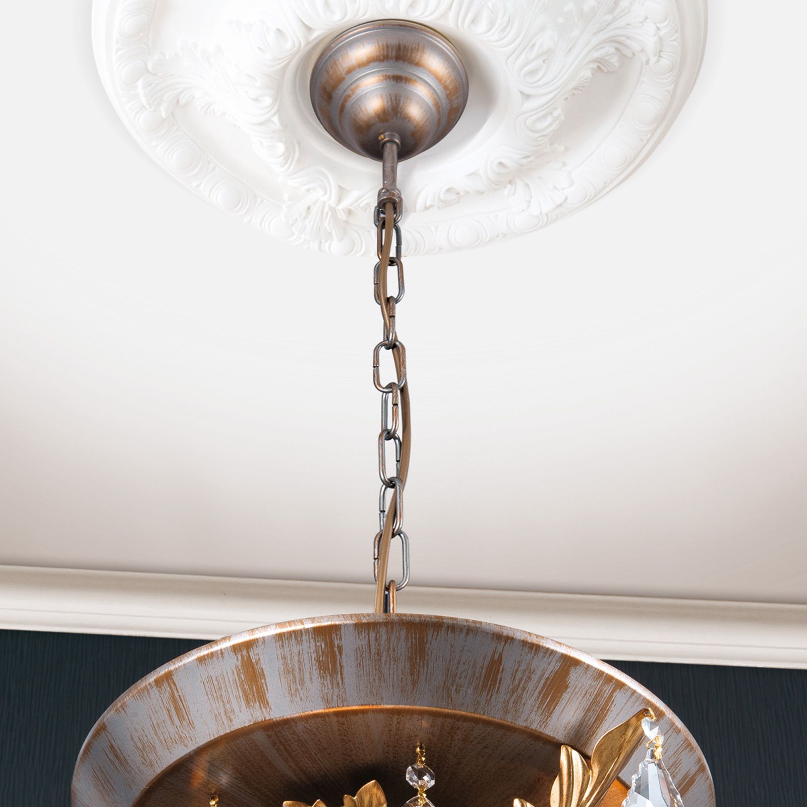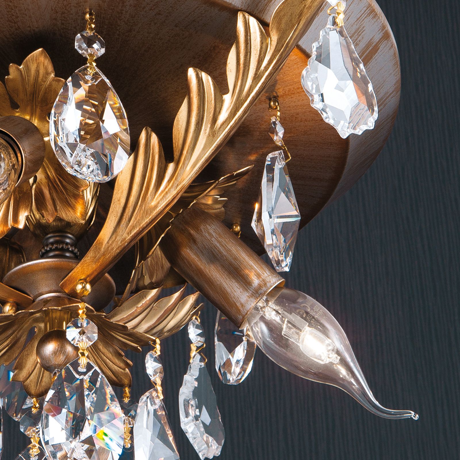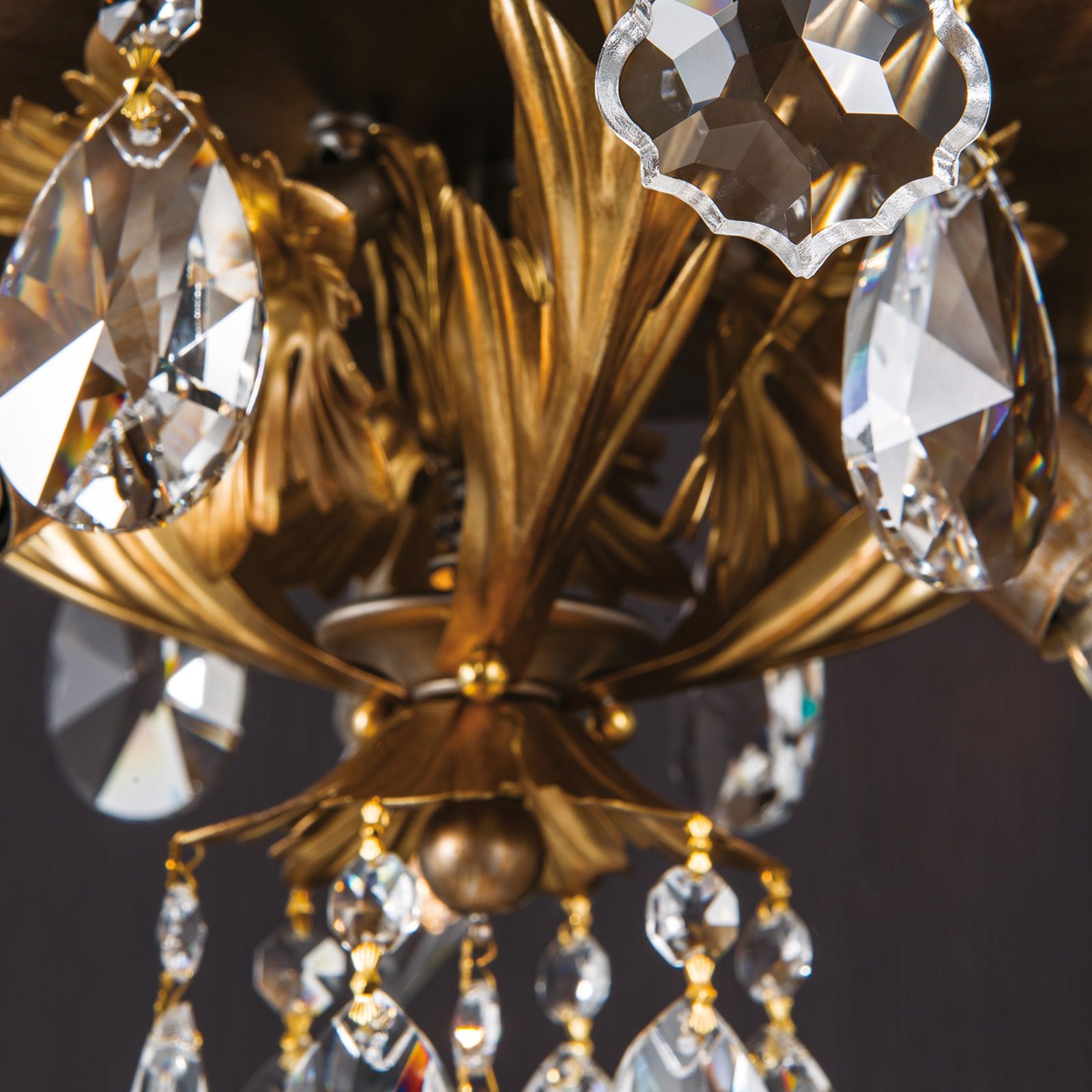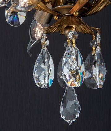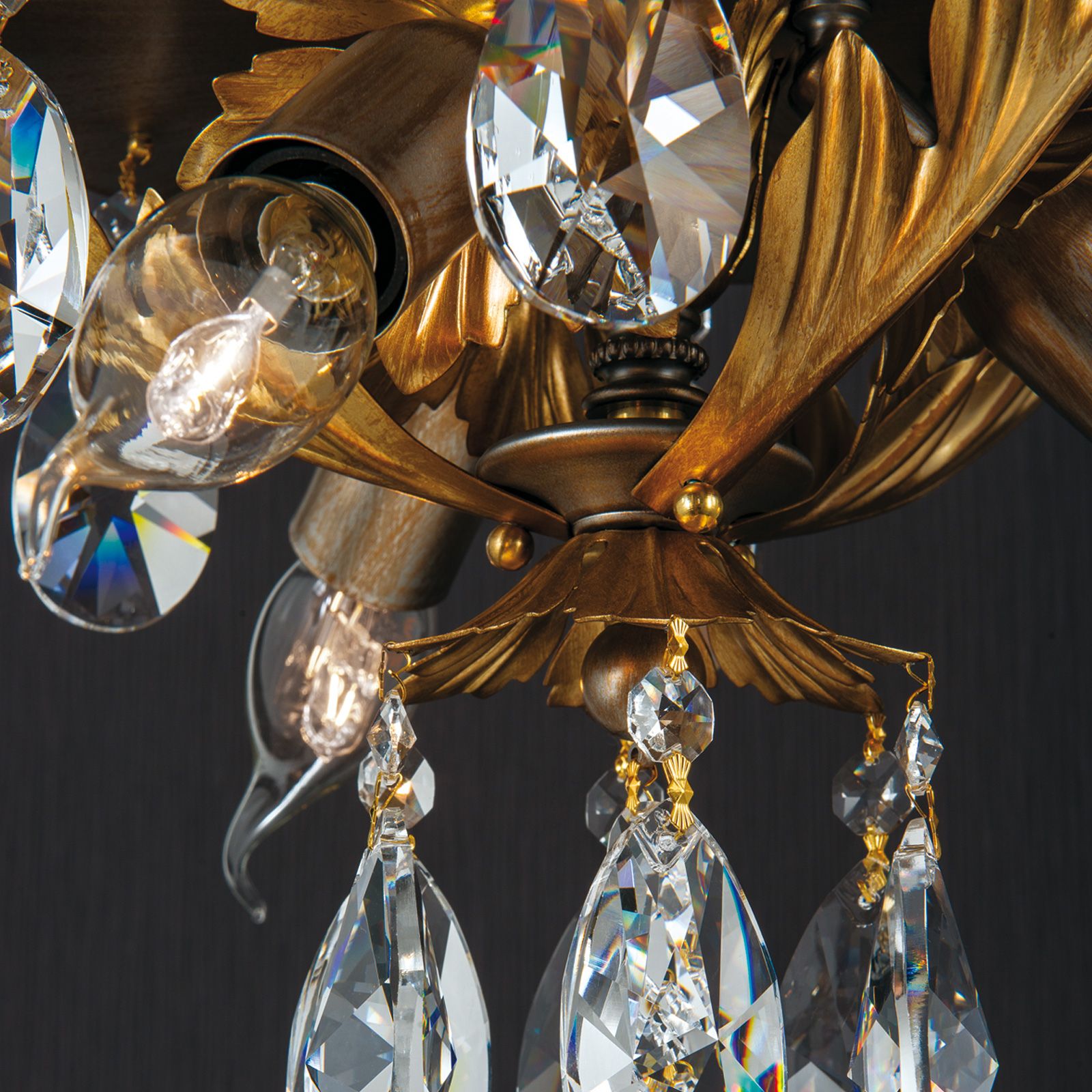 The 3-flame pendant lamp from the MIRAMARE series is a Baroque-Late Renaissance gem. Like a precious treasure salvaged from the sea, the light rises above the observer boldly illuminating him or her with three flames. With its wind gust candle look, one almost feels a gentle sea breeze. Penduloques and almonds crystal cast their translucent light into the room generously. In dining rooms, this light composition will beautifully illuminate festive dishes or fine satin bedclothes in bedrooms or an elegant chest of drawers in an anteroom. The light is supplied via five E14 sockets with up to 40 watts each.