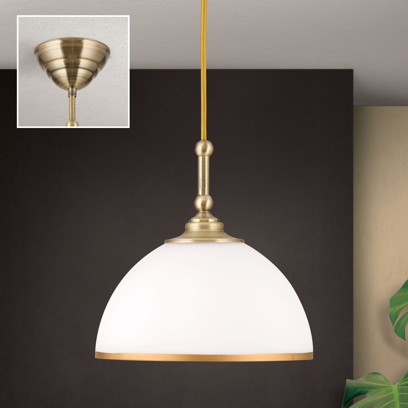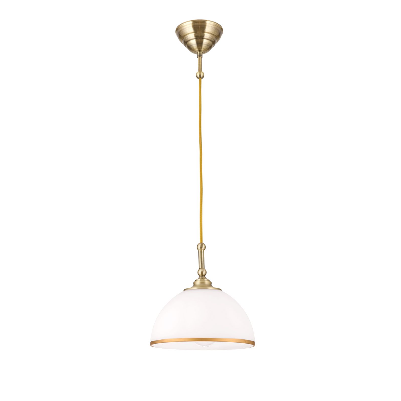 Looking at the OLD LAMP pendant lamp, the light appears as a classic light source with a semi-circular shade made of high-quality opal matt glass. Here, it emits the light for direct illumination downwards as well as through the glass into the room, but in a subdued, soft form. The shapely shade is completed by the frame in patina finish with matching golden textile cable. A patina-coloured decorative band on the glass shade provides that certain something, which rounds off the design perfectly and makes the light a real eye-catcher. However, OLD LAMP does not have to shine lonely and alone, it can be lined up with several of its kind. With an E27 socket, it is operated with a maximum of 40 watts.