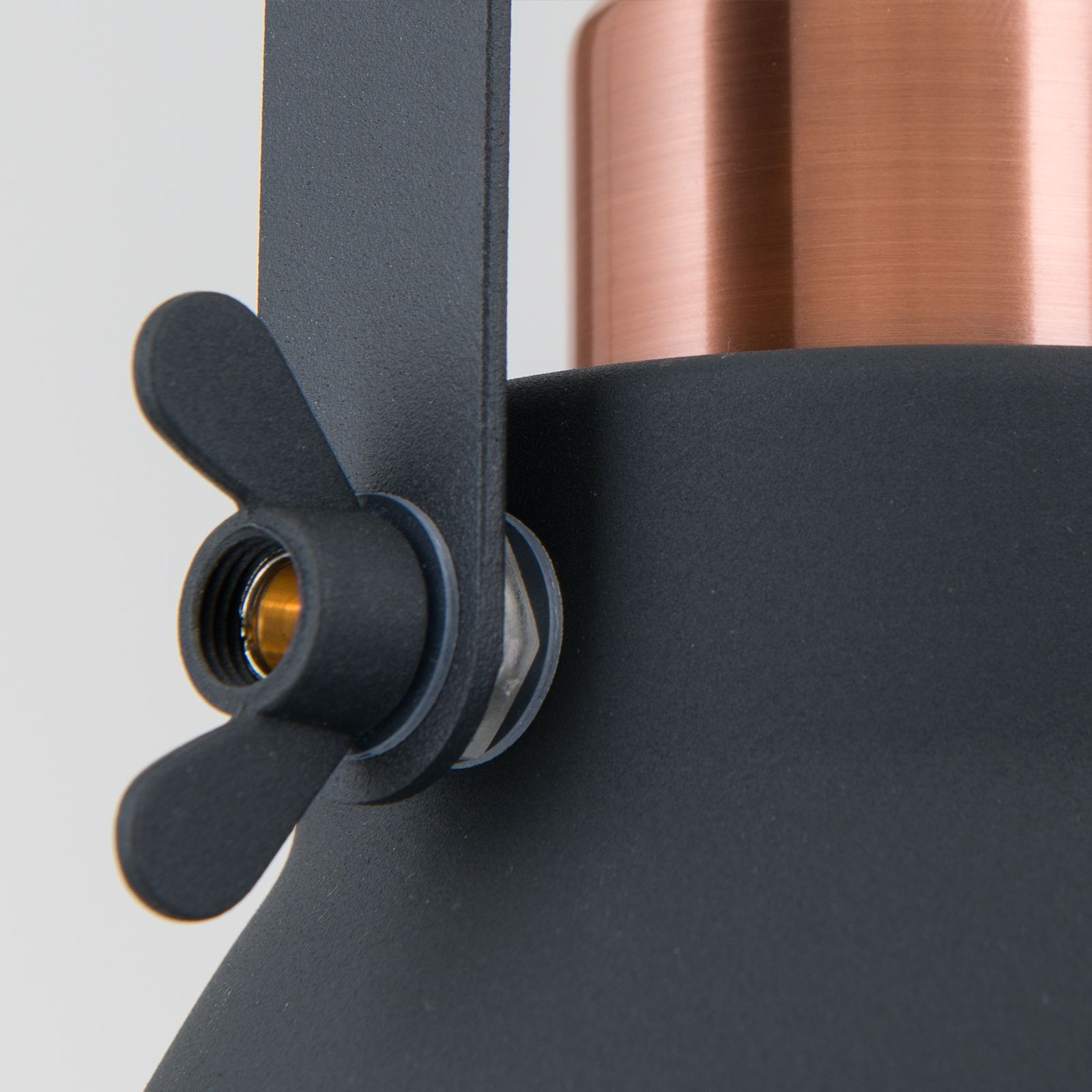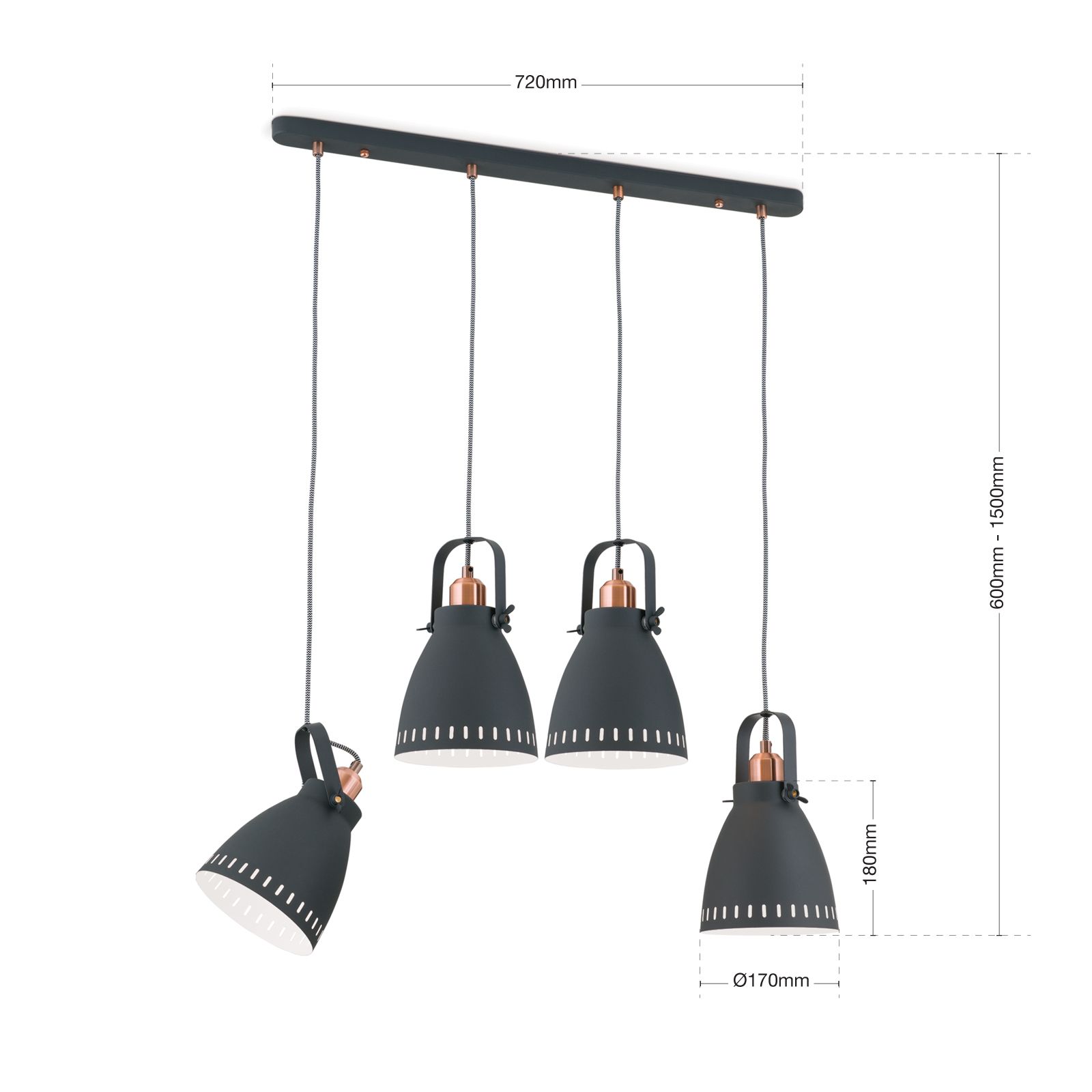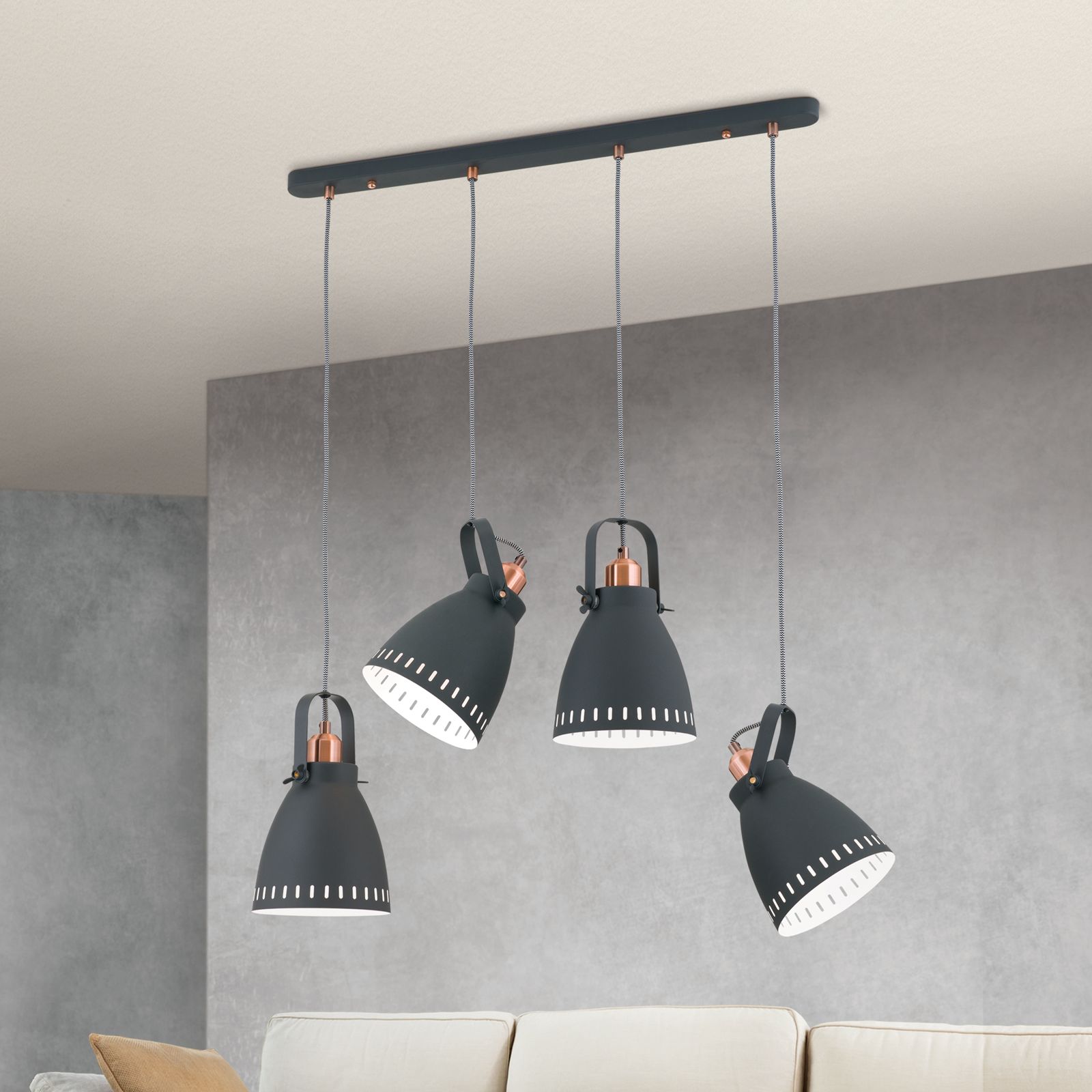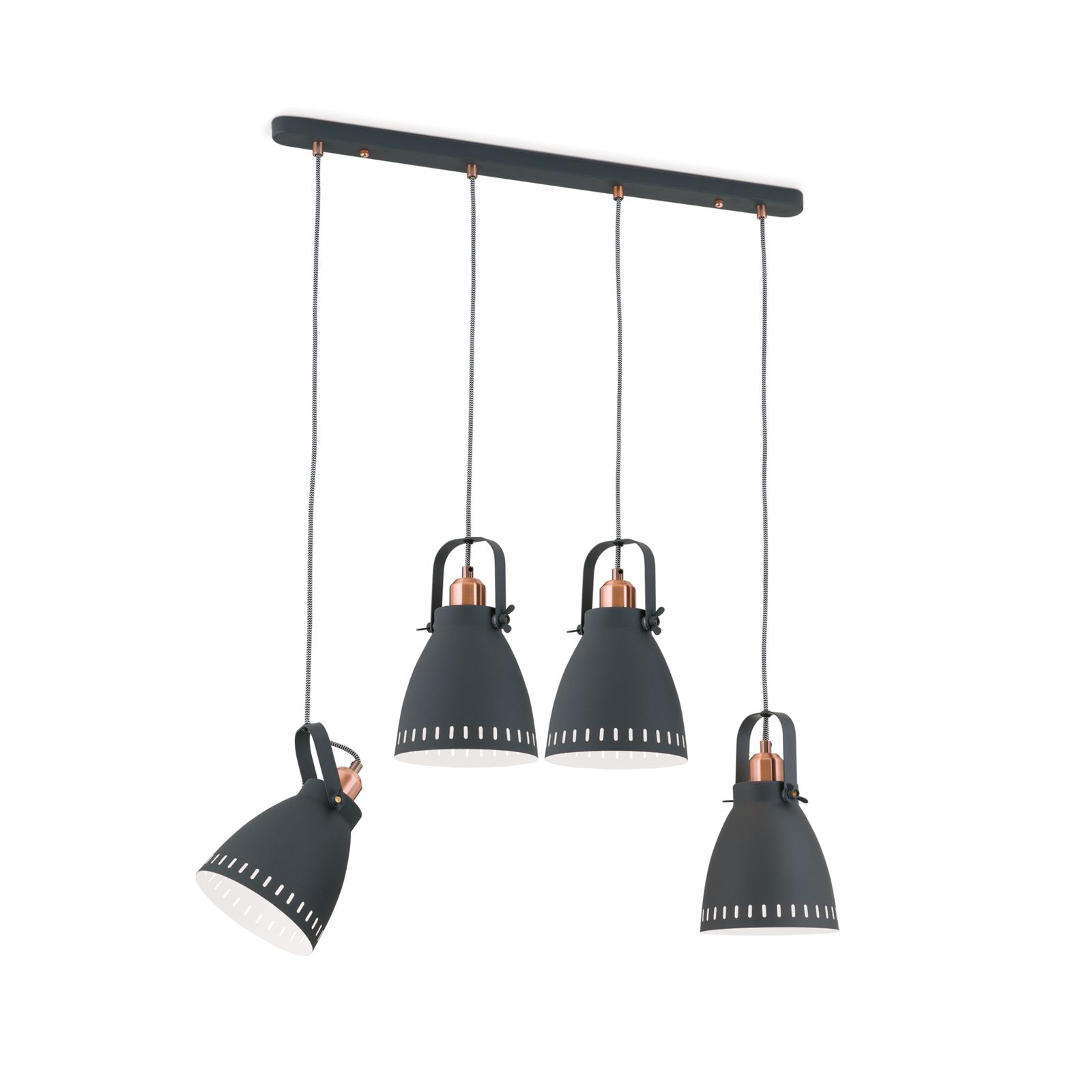 Pendant lamp THEKE owes its German name to its functionality: suspended over a counter, long dining table or kitchen island, the lamp shades can be adjusted precisely to desired height and angle. The detailed design embellishes every interior: copper elements alternate with black matt coated steel structured by elegant cut-outs on the lamp head and around the shade's rim. Two butterfly nuts ensure a secure hold when tilting the shade. The fabric-look cable leading to the mounting strip rounds off the high-quality impression. Four sockets delivering up to 60 watts each, at best to be fitted with LED bulbs in filament optics.