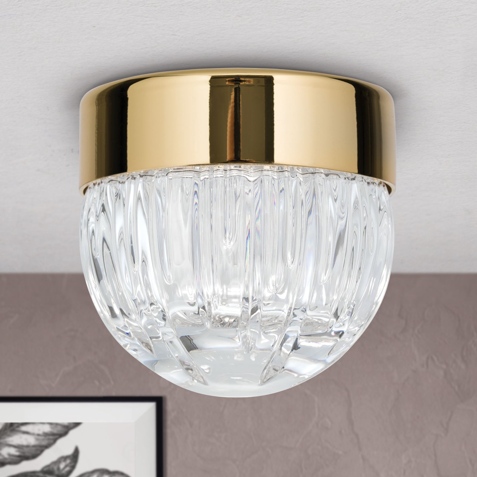 Small but mighty - this is how the ceiling light from the BALL series can be described when it enchants entire rooms with its modern yet classic appearance. High-quality ORION high lead crystal glass in line cut provides radiant light effects. A metal ring made of solid brass surrounds the light connecting it to the ceiling. The surface finish in either silver nickel or 24 carat gold supports the ceiling light's exquisite character. But BALL's inside is also impressive: dimmable and energy-efficient high-voltage A/C LED boards in 3000 Kelvin (warm white).