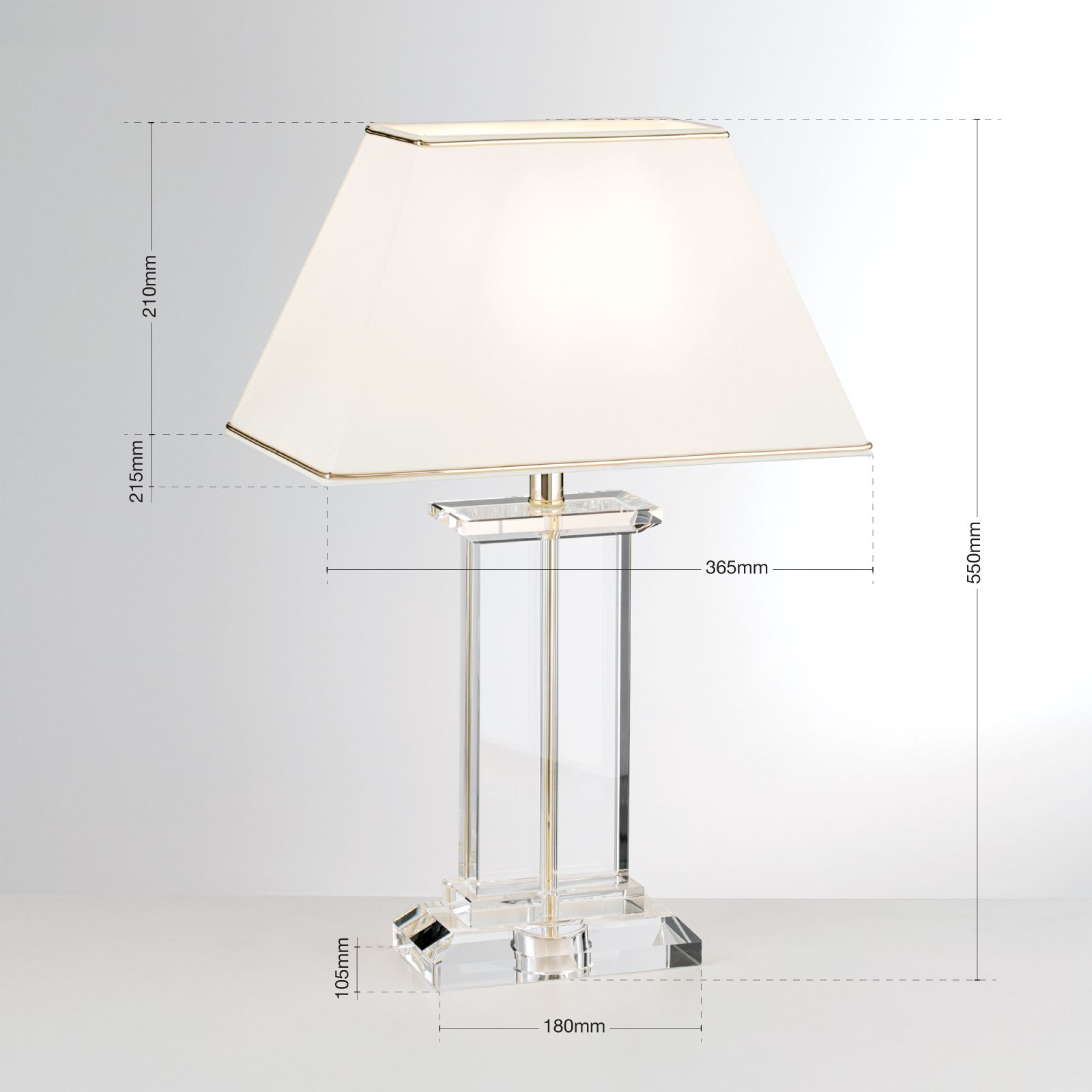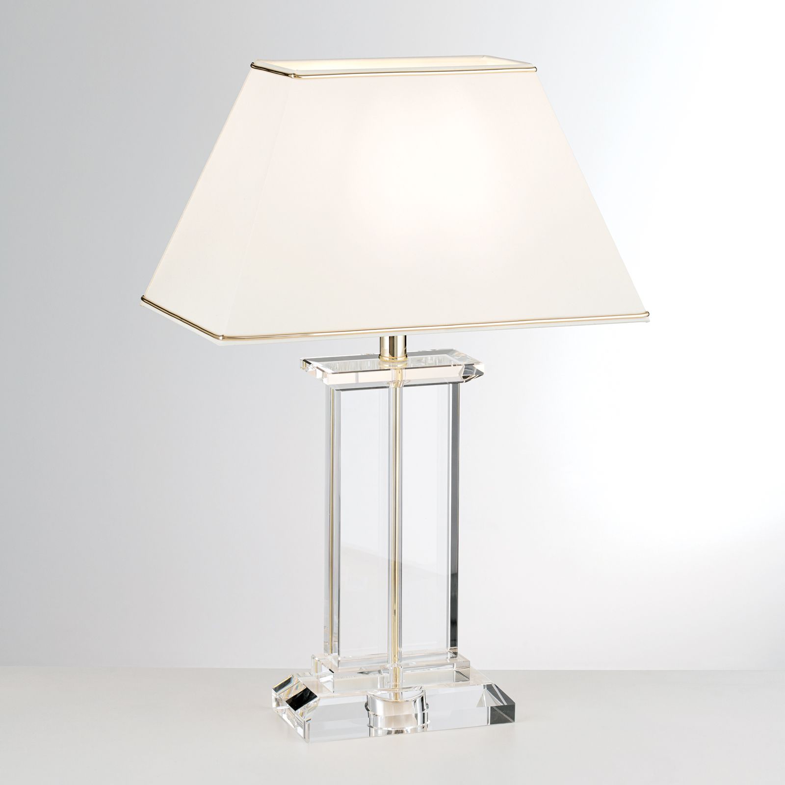 Table lamp VERONIQUE convinces with clear lines and the combination of a gold or silver framed lampshade and transparent crystal body.