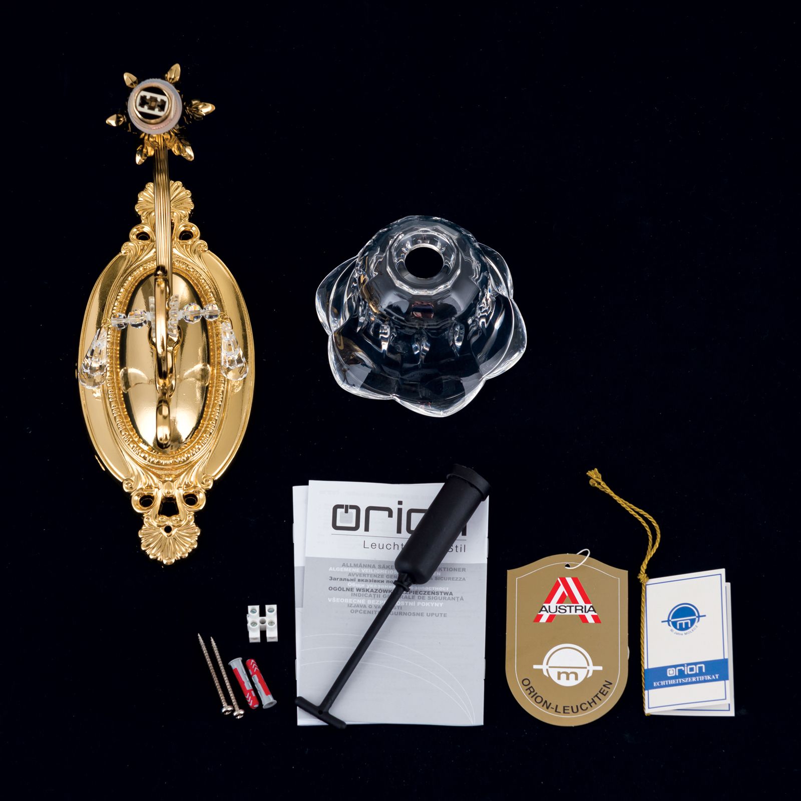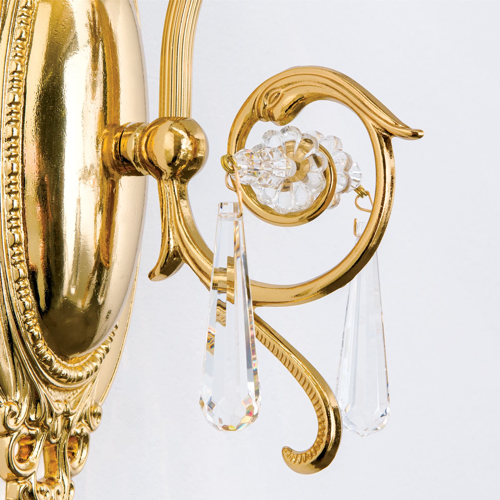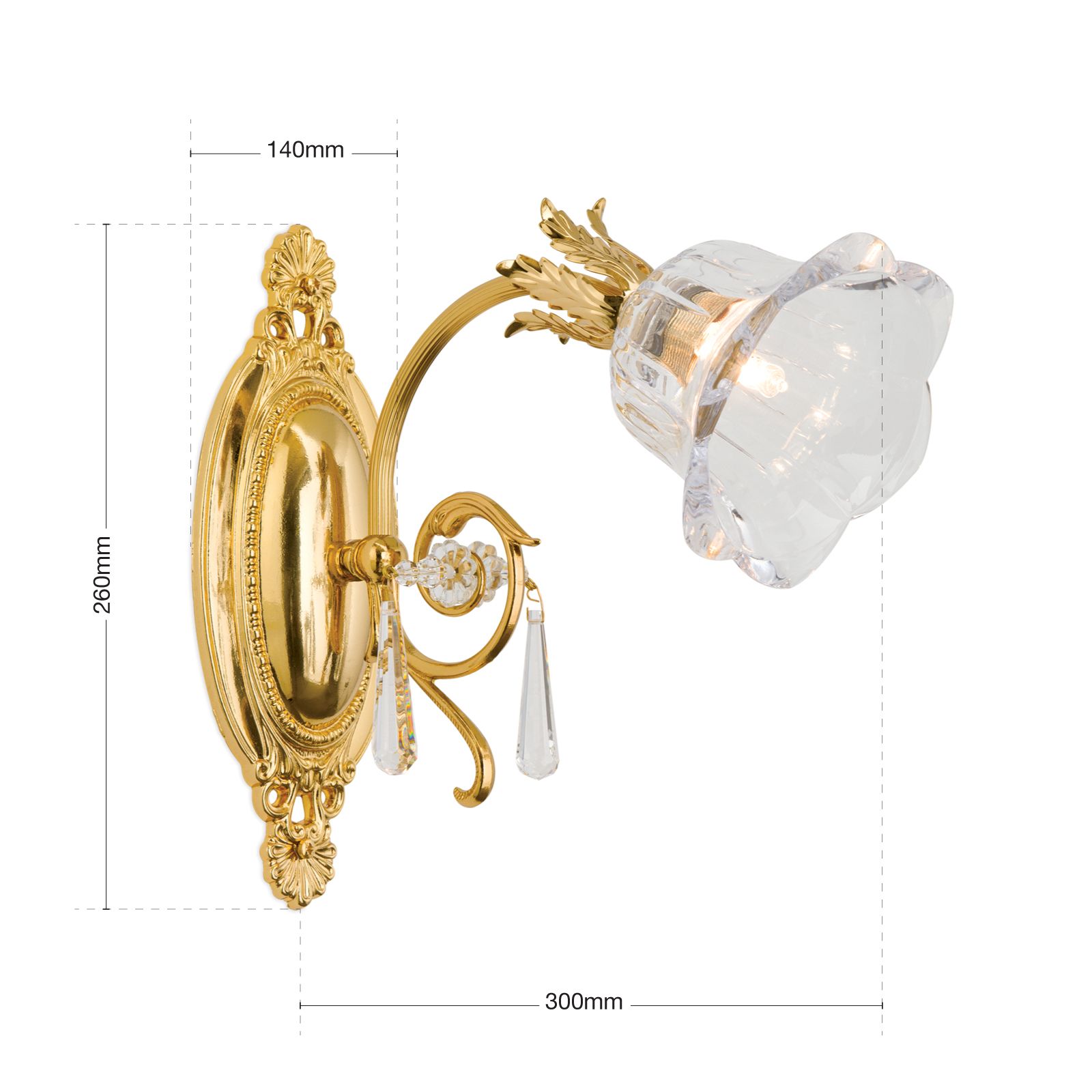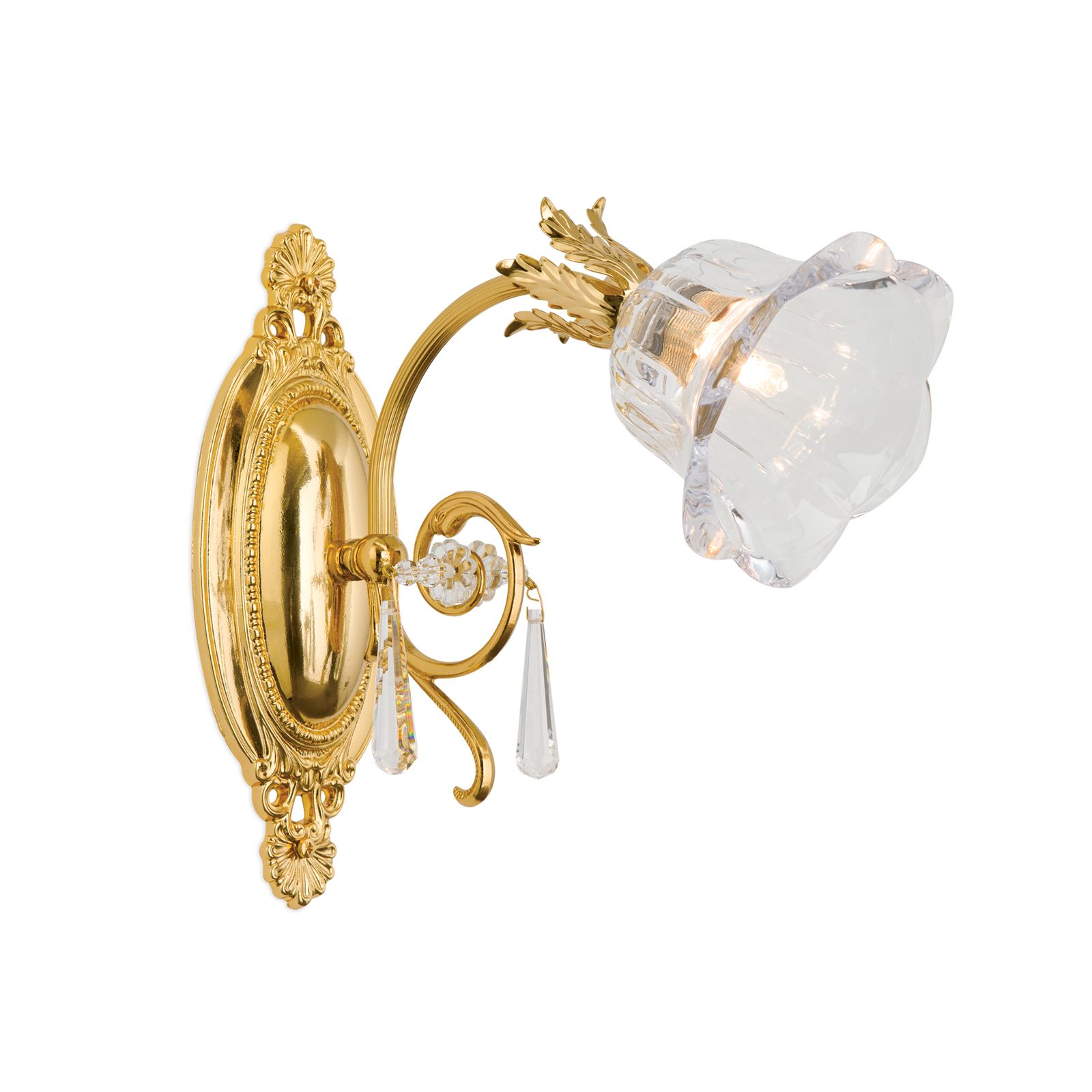 The solid brass frame consists of an artfully decorated oval wall bracket and dowards curving lamp arm. The arm is adorned with 1A full-cut chandelier crystal, adding extra sparkle. The shapely shade made of clear crystal glass reminiscent of a flower radiates light in all directions.