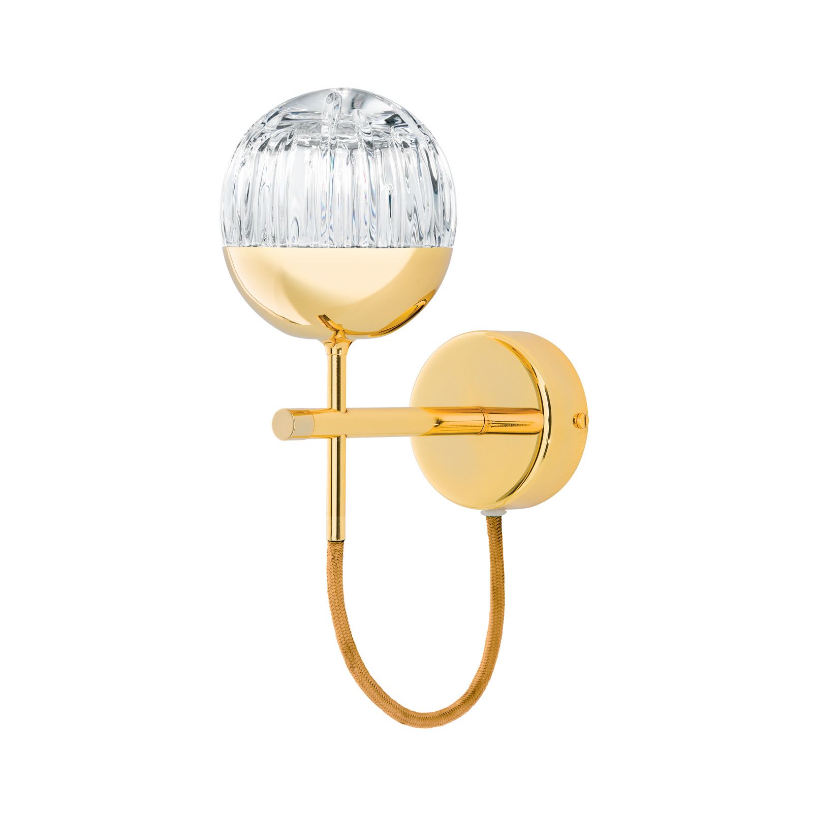 Wall light BALL, gold, with golden decorative cable and clear crystal glass in line cut