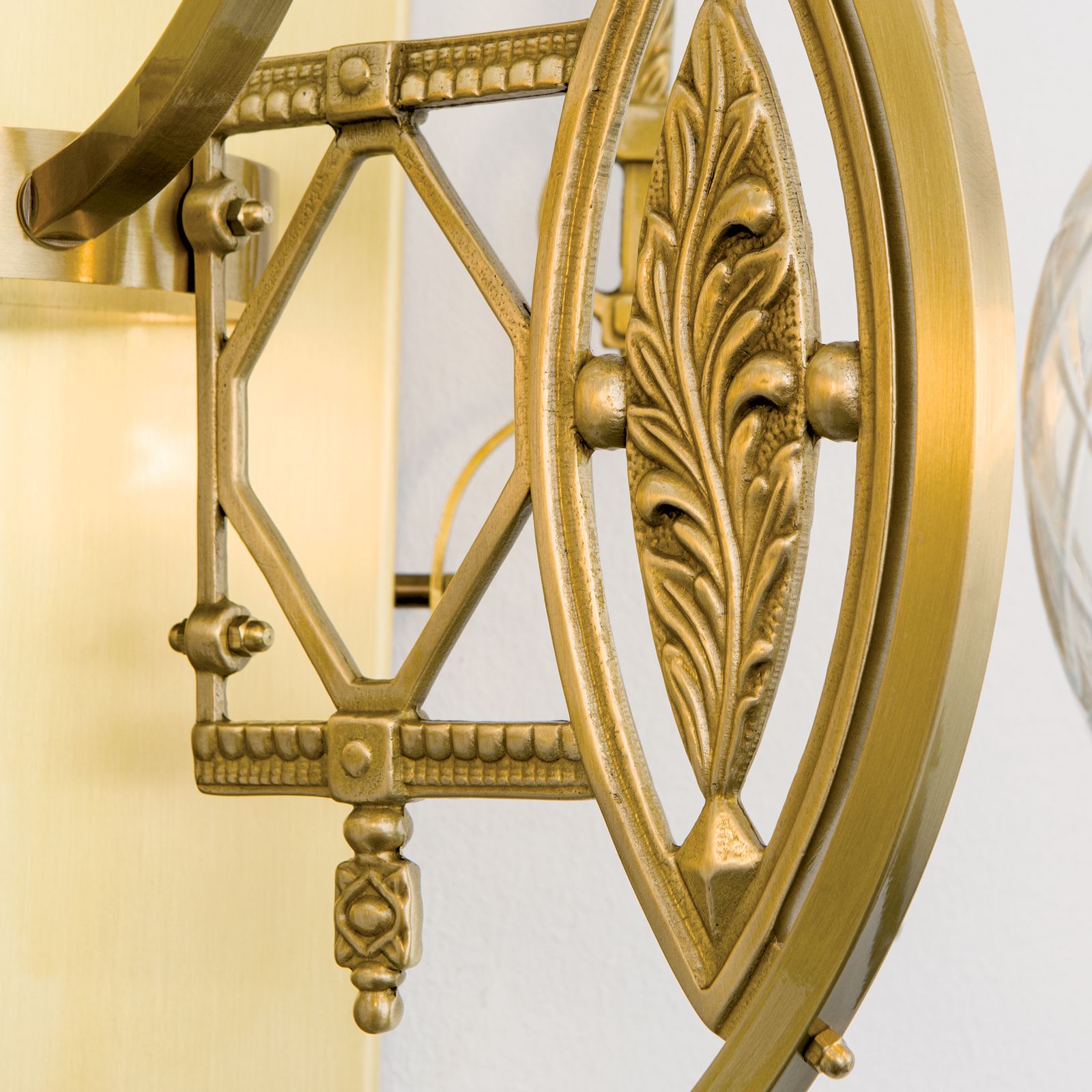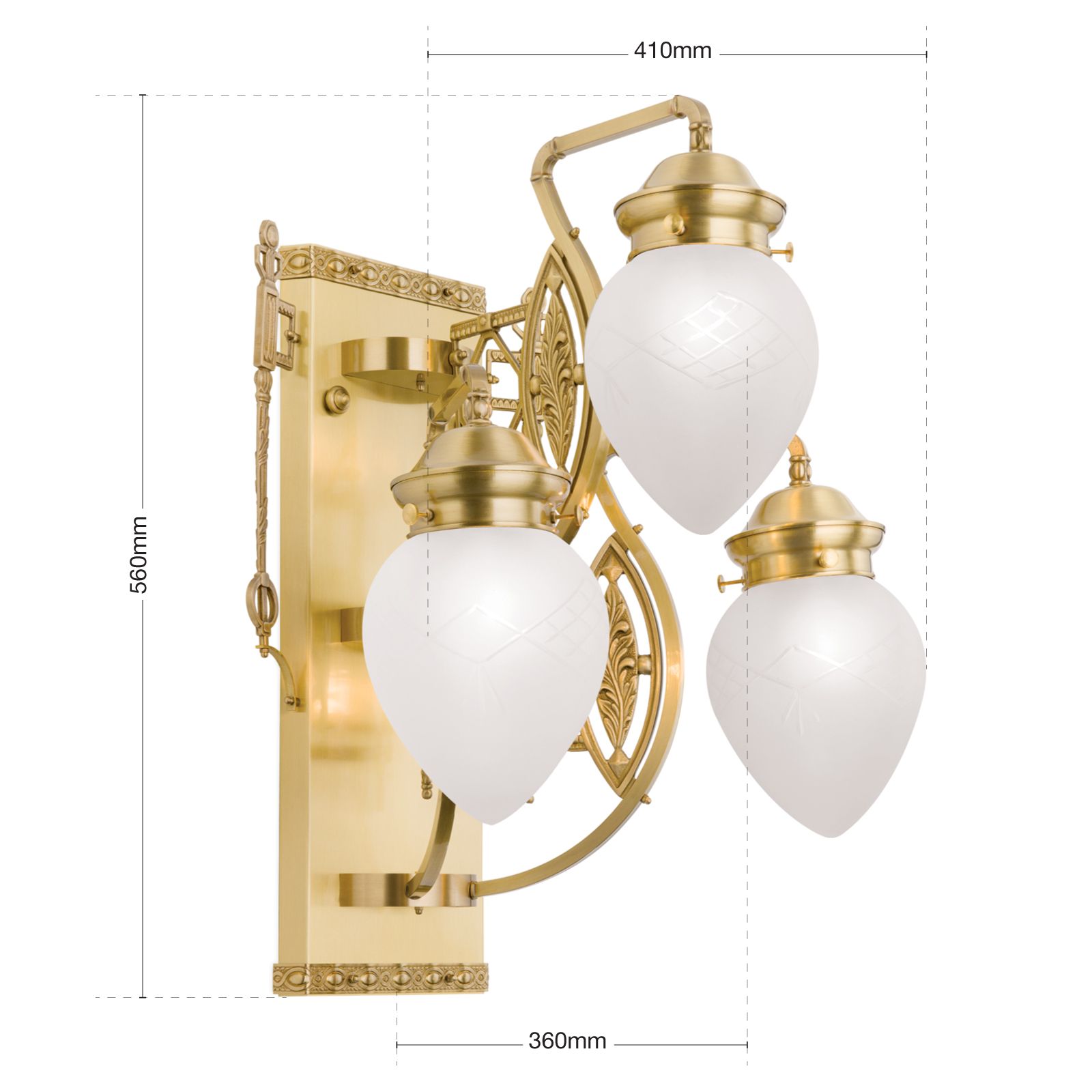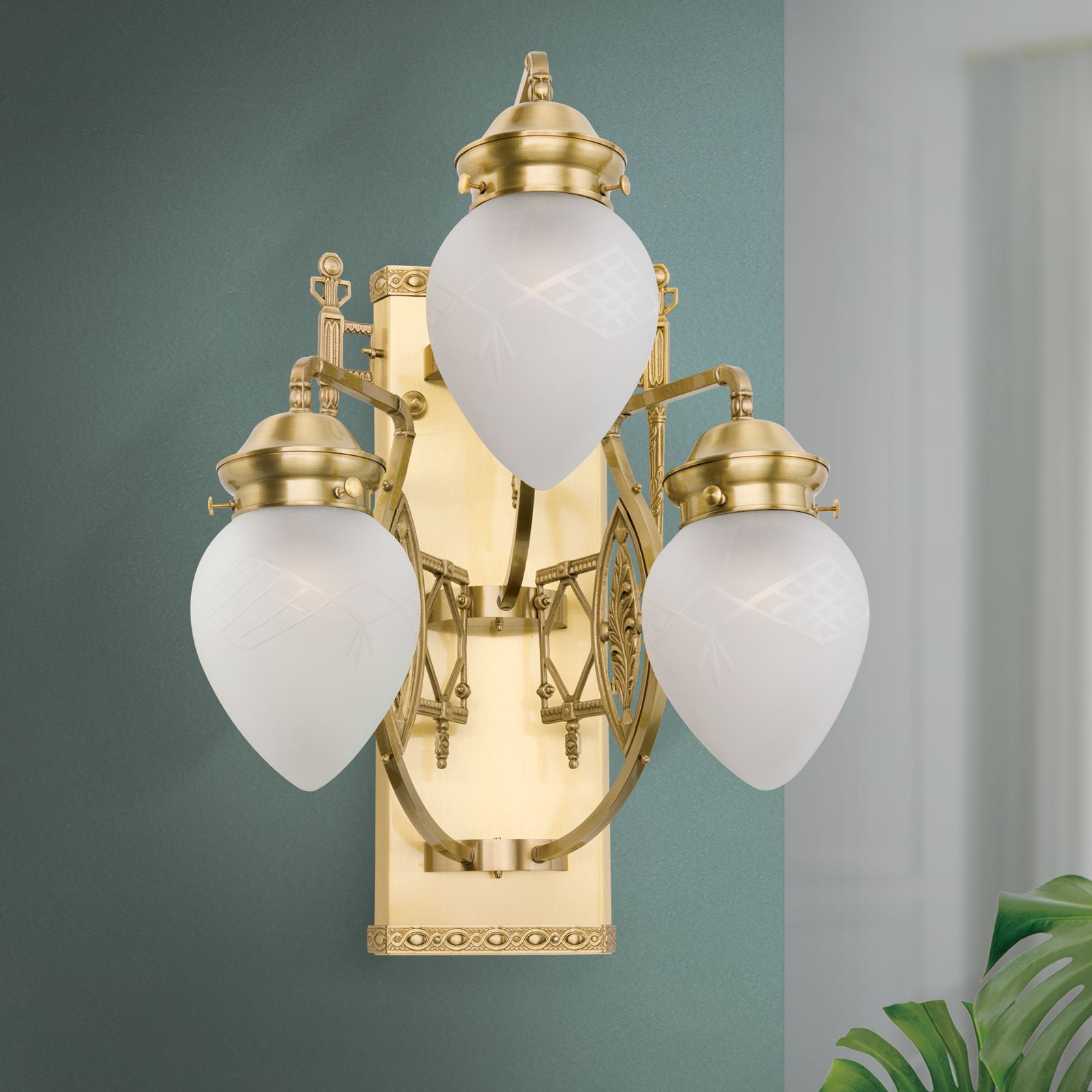 3-flames wall light from the BUDAPEST series radiates light evenly into the room and offers many styling options with its imaginative interpretation of Art Nouveau. Traditional Hungarian folklore of the surrounds meets Vienna Secession decoration and Baroque-style ornaments. On either side of an oriental ottoman or Art Nouveau bench, this wall light will cut an equally fine figure.