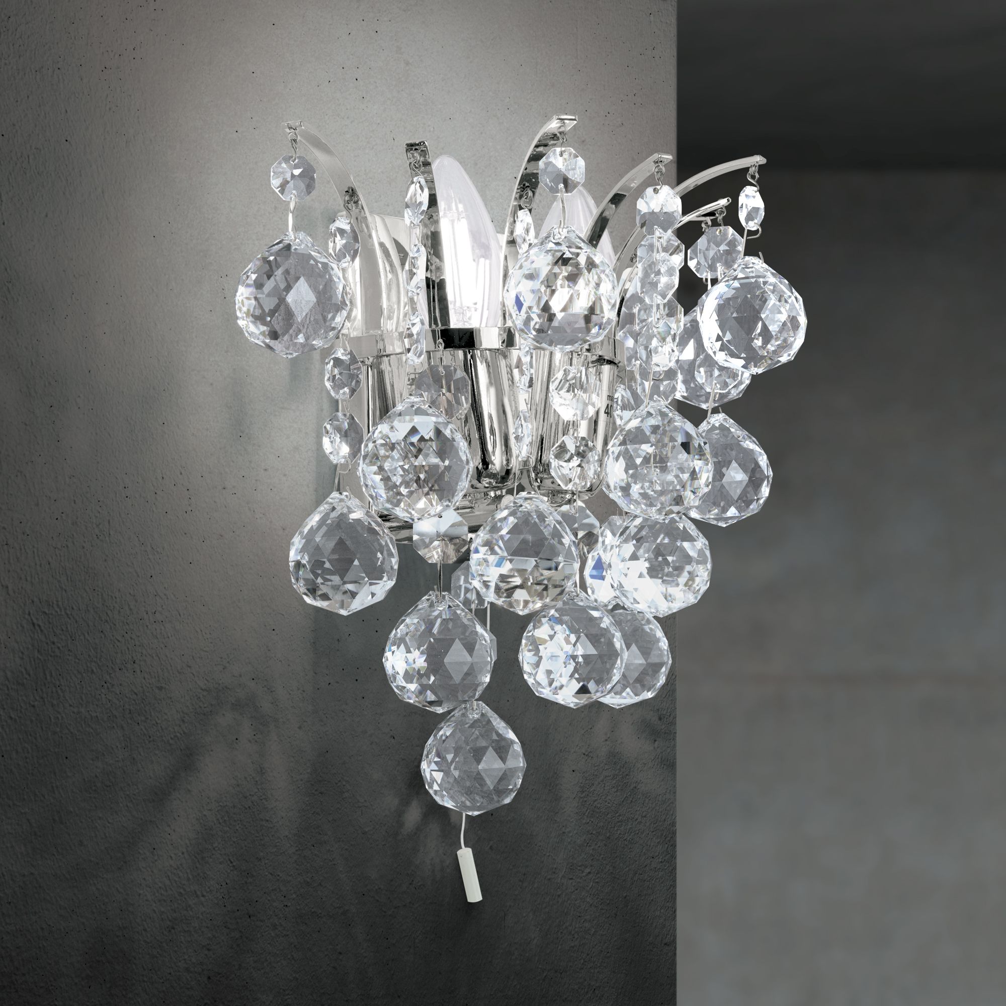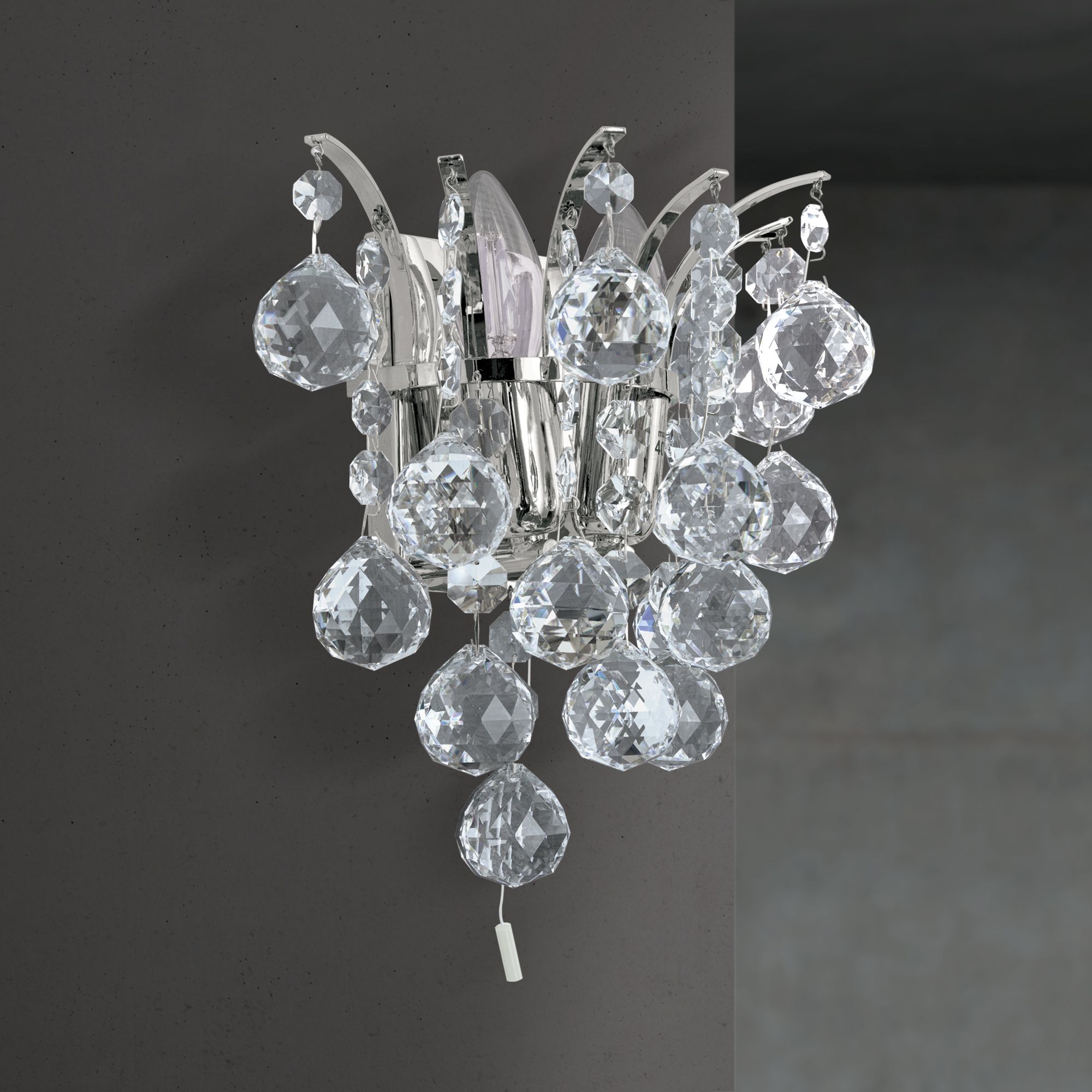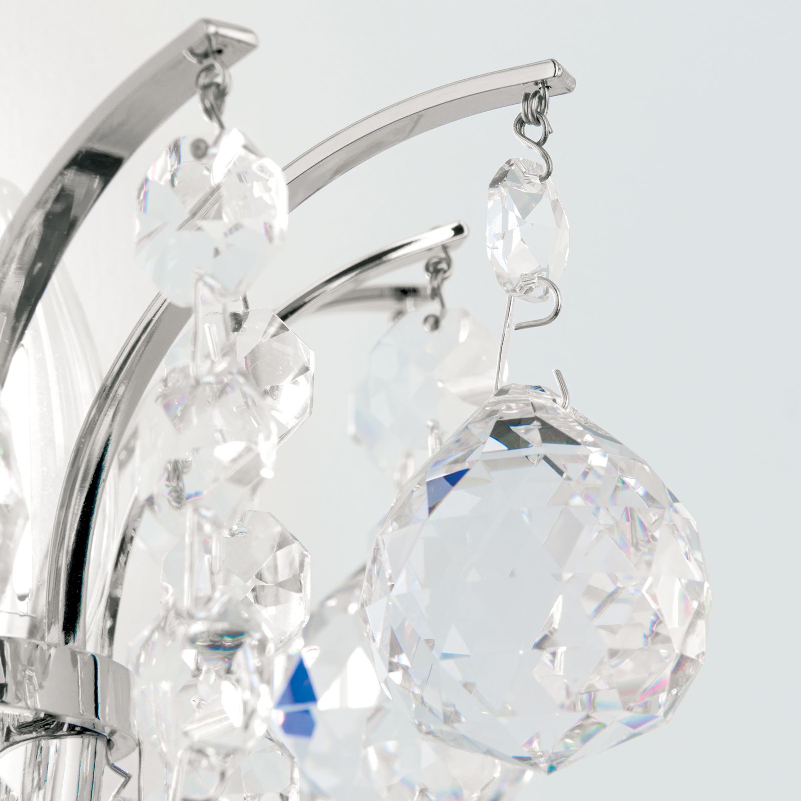 This impressive wall light's main feature is definitely the wonderful Asfour chandelier crystal in the form of octagons and faceted spheres. Whether in classic or modern interiors, there are manifold possible applications whether the wall light is combined with other lights from the series or used as decorative accent lighting. Curved stays are mounted on the shiny wall bracket, from which shapely crystals hang down in chains. When the light falls on them, they begin to glitter and sparkle, creating unique light reflections. 2 E14 sockets can be operated with 40 watts maximumand, if necessary, brightness can also be adjusted with a dimmer. The light can be easily and conveniently switched on and off by means of a switch.