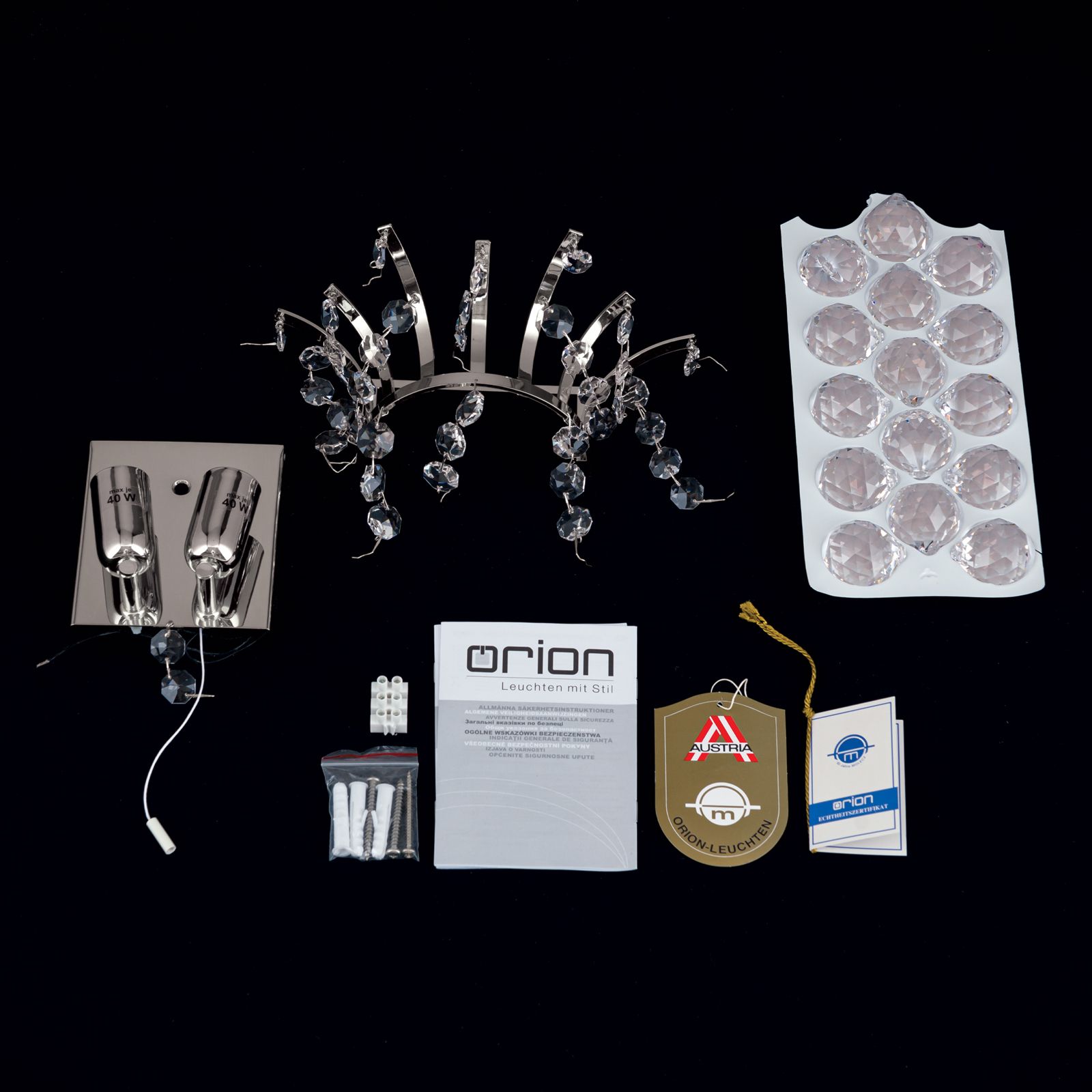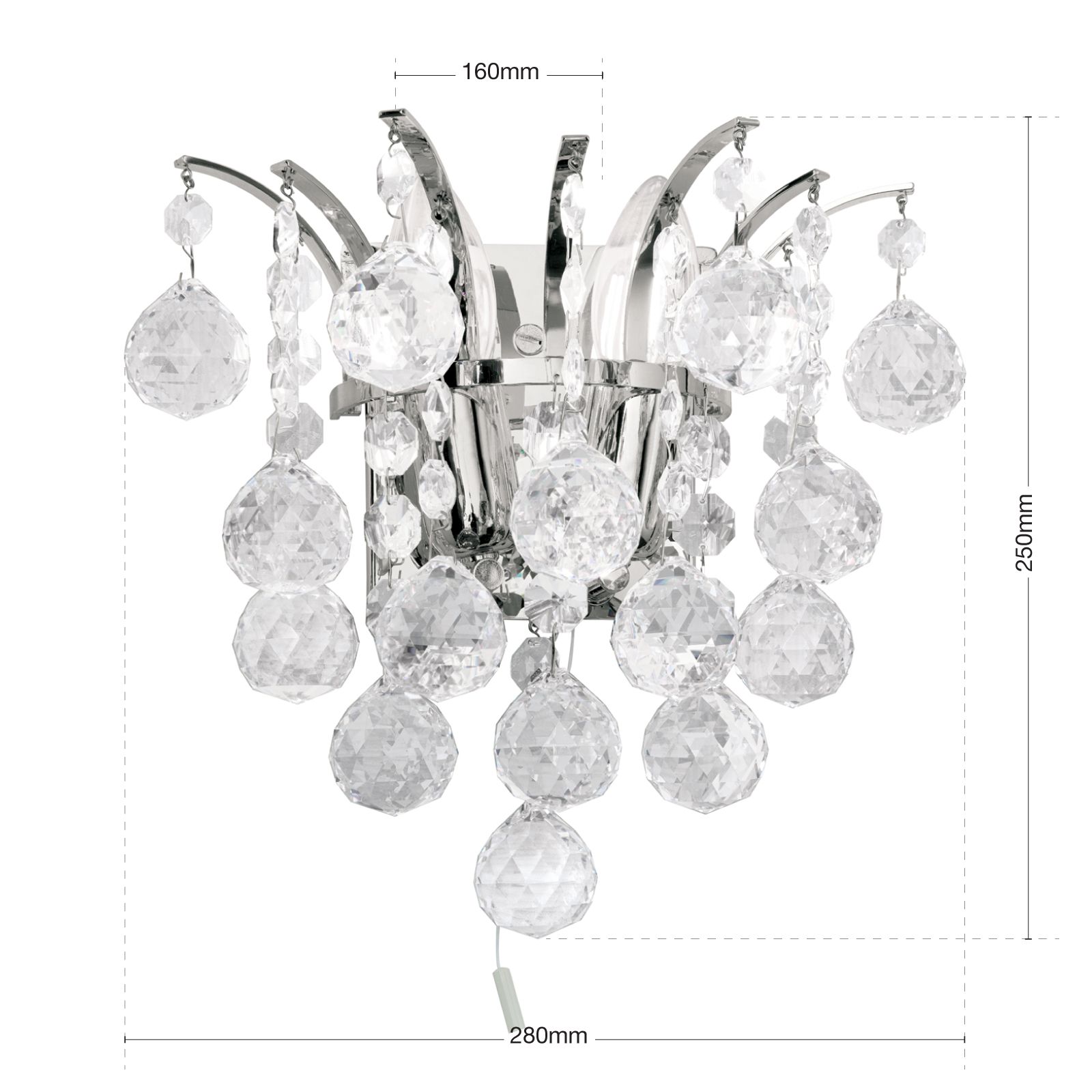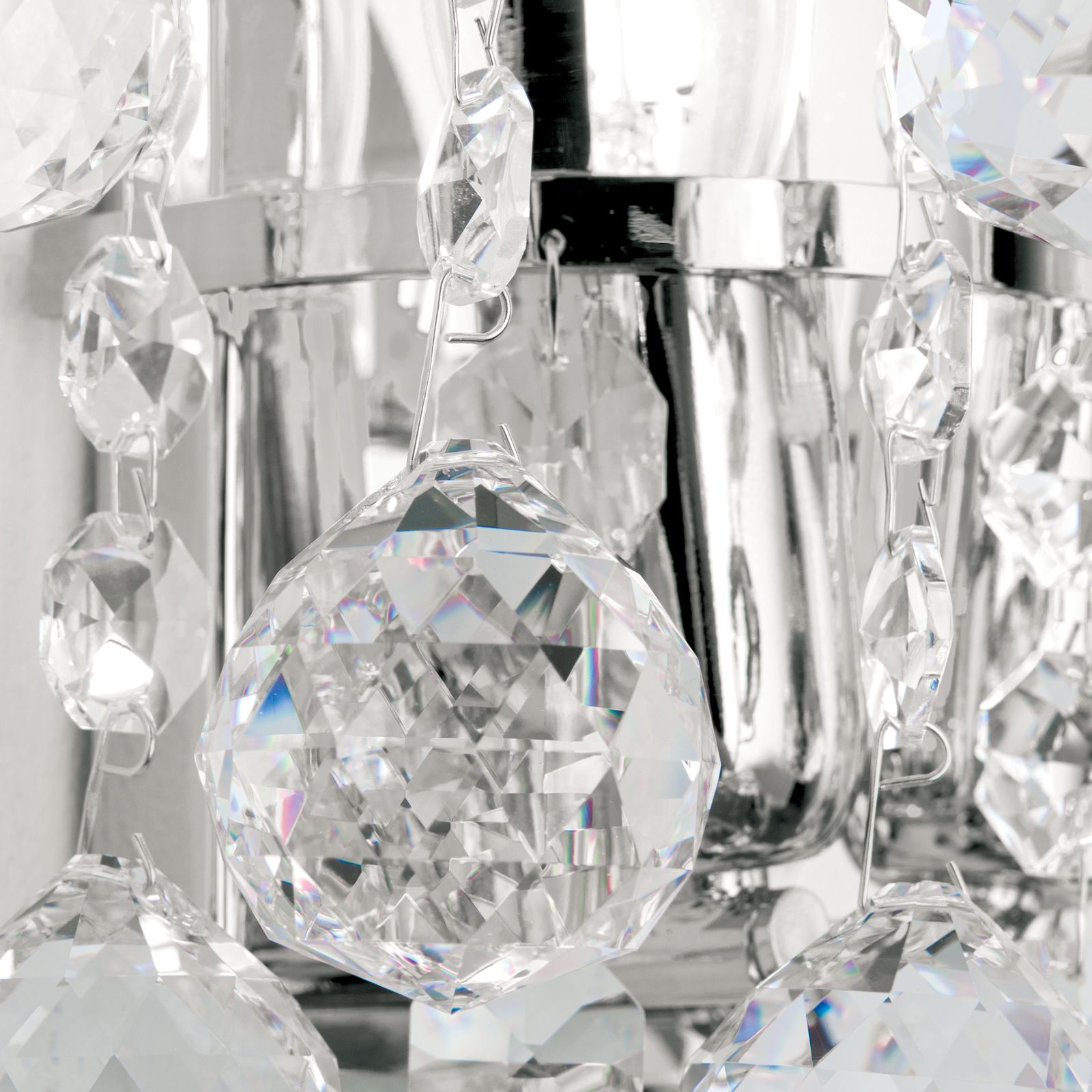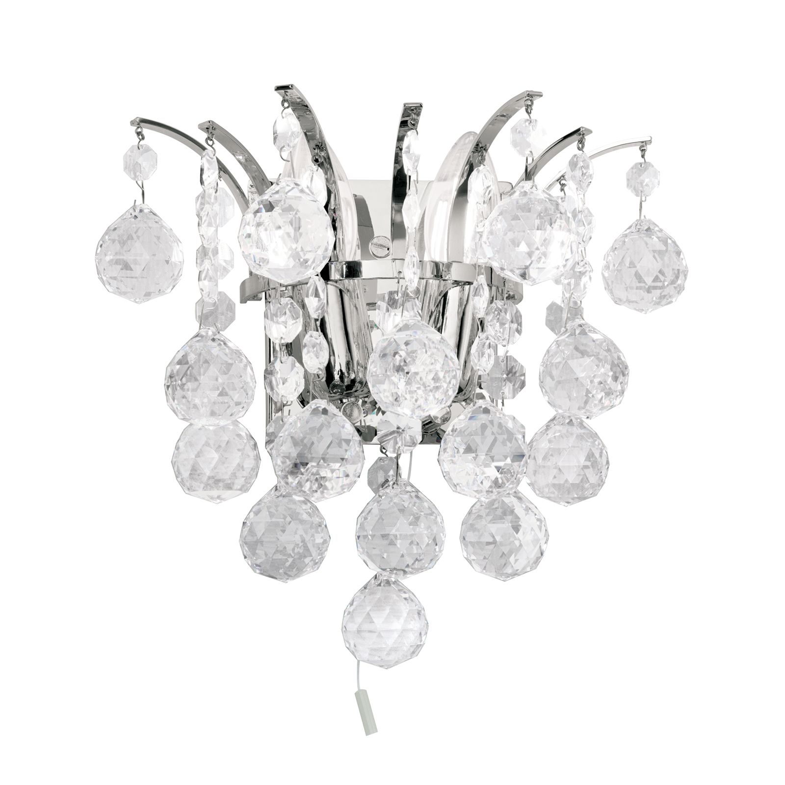 This impressive wall light's main feature is definitely the wonderful Asfour chandelier crystal in the form of octagons and faceted spheres. Whether in classic or modern interiors, there are manifold possible applications whether the wall light is combined with other lights from the series or used as decorative accent lighting. Curved stays are mounted on the shiny wall bracket, from which shapely crystals hang down in chains. When the light falls on them, they begin to glitter and sparkle, creating unique light reflections. 2 E14 sockets can be operated with 40 watts maximumand, if necessary, brightness can also be adjusted with a dimmer. The light can be easily and conveniently switched on and off by means of a switch.