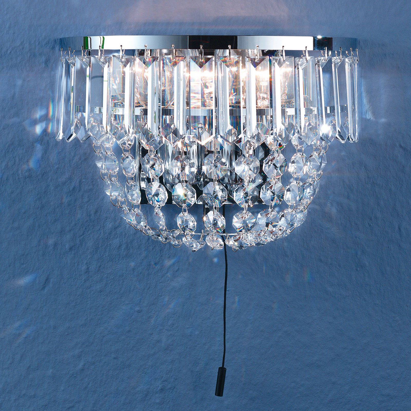 Prismatic crystals hang down from the light's upper shiny frame. One tier below a second semicircular frame with chains made of 8-cornered crystals running towards the wall to creae a beautiful finish. The frame is made of brass with a shiny finish intensifying the light's sparkle. Behind the crystals, 2 E14 sockets can be fitted with 40 watts maximum. The light can be switched on and off with a pull switch.
