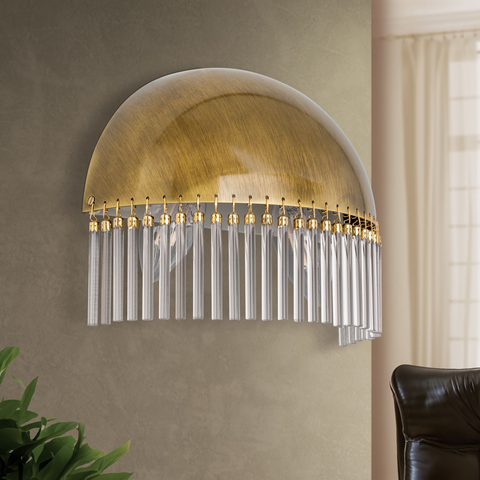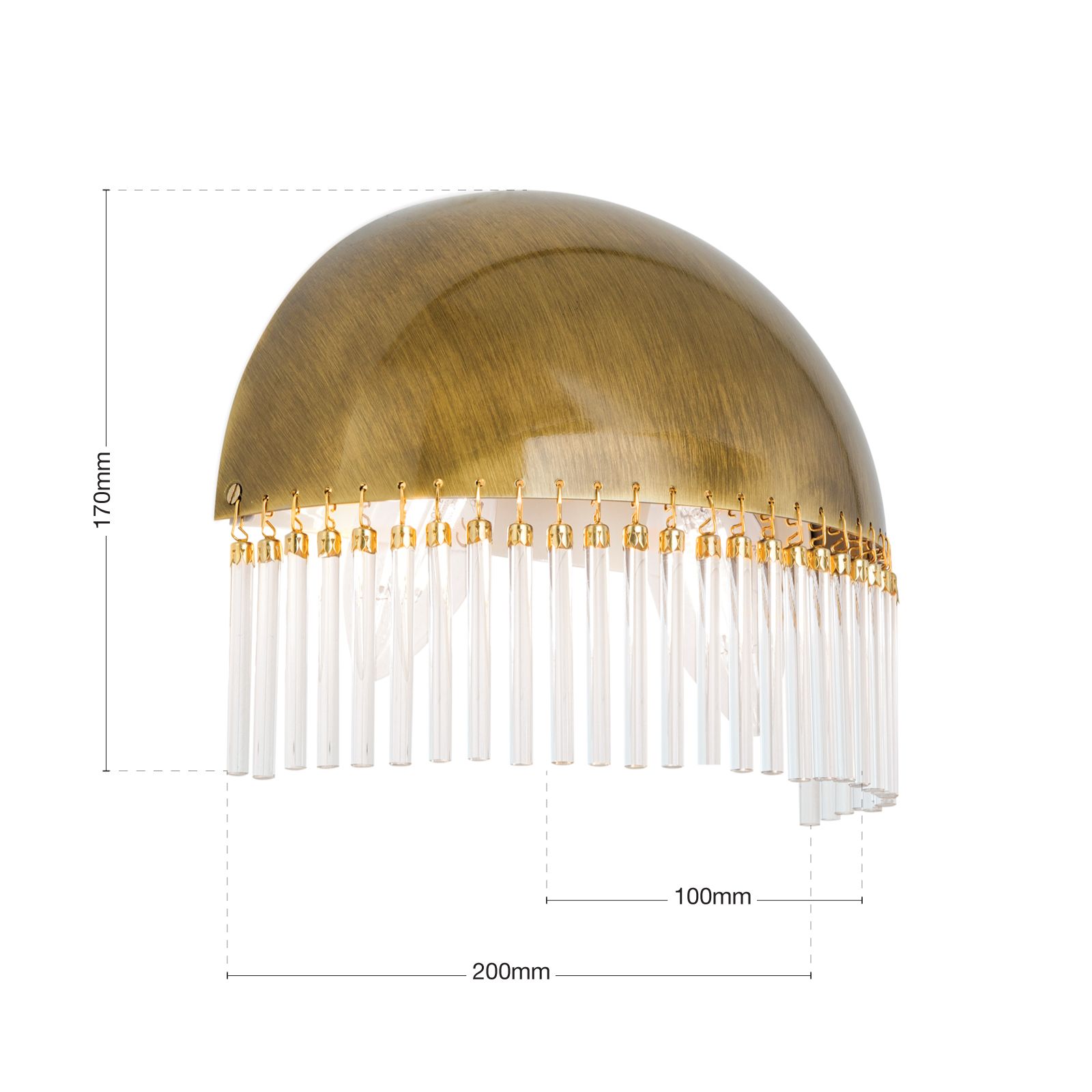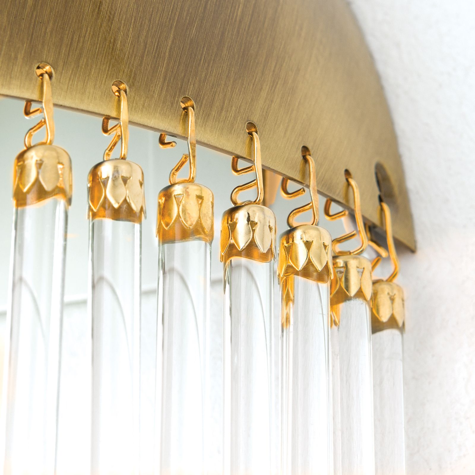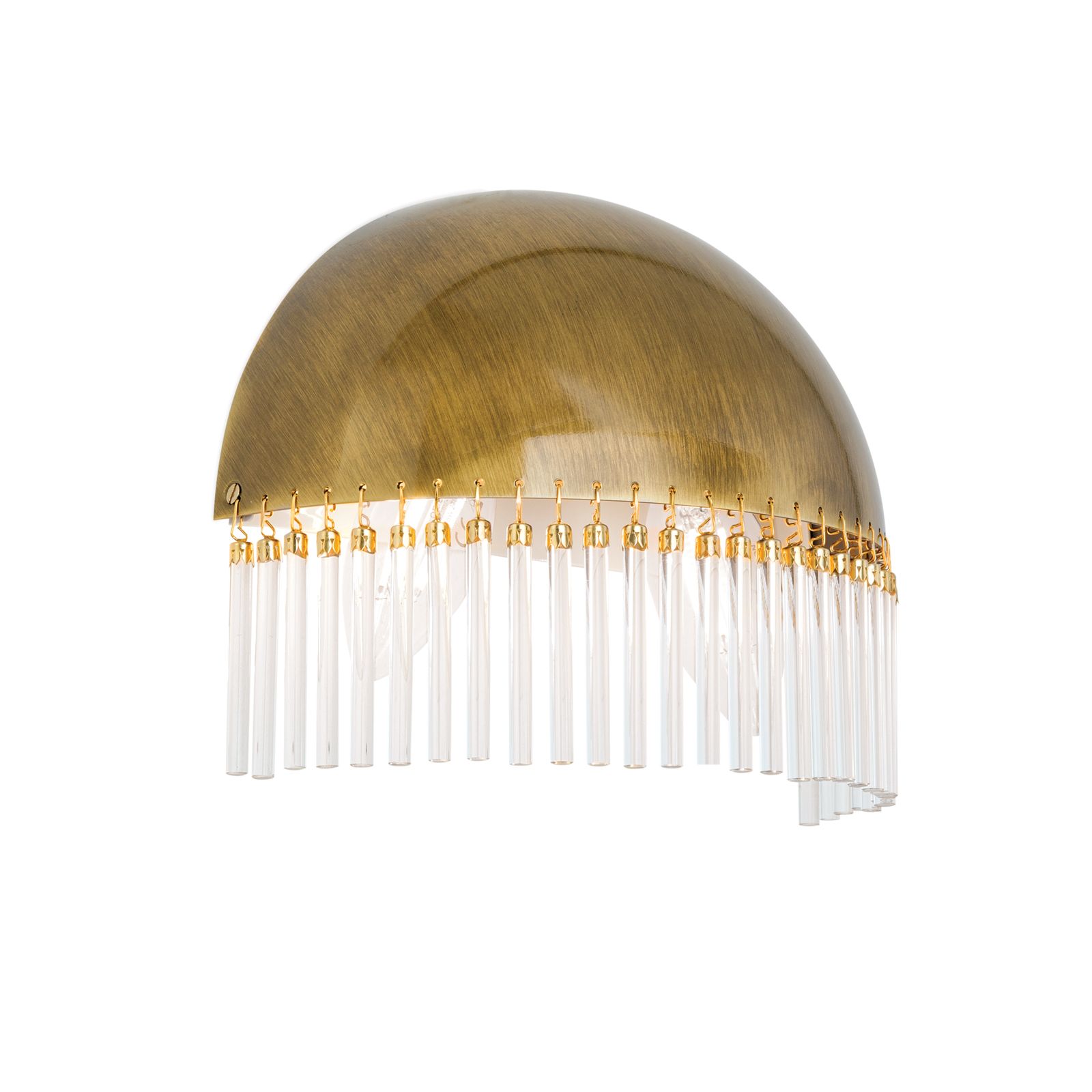 The wall light STÄBCHENSERIE impresses with its unique design with glass rods mounted on a semicircular cap. These glass elements magically catch the light and create a fascinating play of light in your room. The carefully placed glass rods provide a gentle diffusion of light and create a pleasant and atmospheric illumination.